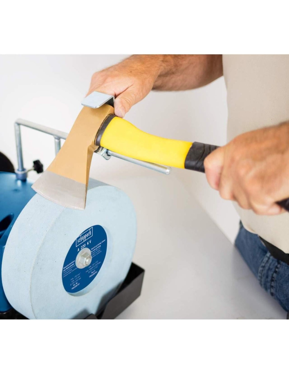 Il dispositivo di supporto Scheppach JIG 40 per grandi coltelli o ascie permette di sostenere saldamente l'ascia garantendo un angolo di affilatura costante.