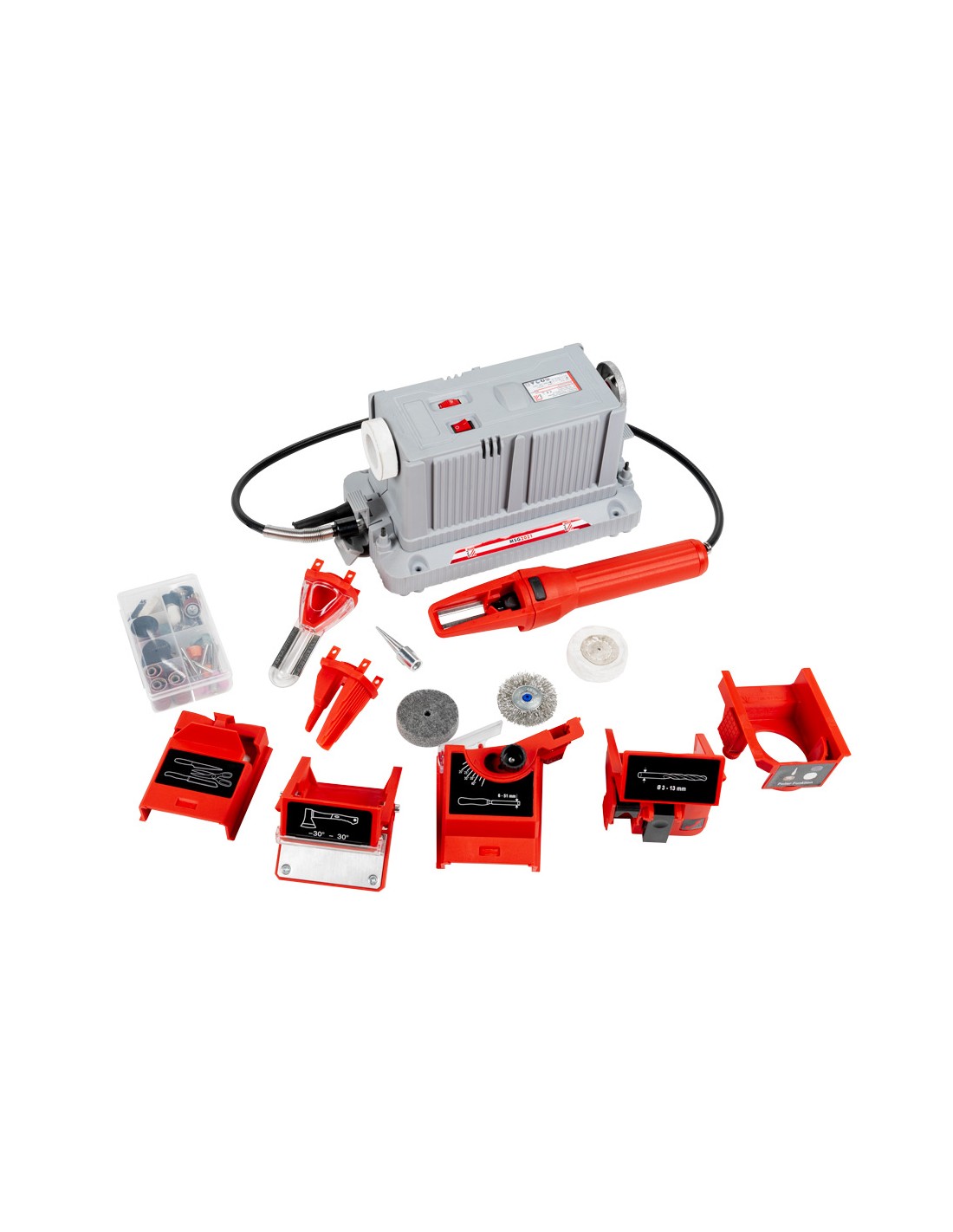 Dotazione: Disco diamantato D.51 x D.10 x 7,5 mm, disco al corindone D.50 x D.11 x 8 mm, rulli in gomma D.12 mm, 8 cilindri di affilatura D.12,7 mm (grana 120); pasta lucidante, ruota in filo di ottone, disco in spugna, disco lucidante, rullo in gomma D.6 mm, cilindro abrasivo D.6,3 mm (grana 120), disco abrasivo D.20 mm (grana 180); disco da taglio D.24 (10x marrone; 20x nero); cilindro abrasivo corindone 6x10mm, cono abrasivo corindone (10x6mm); sfera abrasiva corindone (10mm); disco abrasivo carborundum (1x 20x6mm, 1x 10x6); cilindro abrasivo corindone (1x 15x10mm, 1x 10x13mm), pinze di serraggio (2,4 x 4,4 x17 mm), supporto per disco abrasivo e da taglio, supporto per disco in feltro, spazzola in nylon 15x9, spazzola in acciaio inox 5x27mm; disco con spazzola in nylon 22; disco con spazzola in acciaio inox 22 22; Penna per incisione su legno D.2 mm; Penna per incisione diamantata D.2 mm; Adattatore di macinazione (tagliasiepi / motosega, lame / utensili); Disco in feltro (D. 25 mm, D. 12 mm, 3x D. 9 mm), pietra per affilare, punta abrasiva in corindone D. 6x10 mm, punta diamantata per incisione, inserti per lima per motoseghe (4, 5, 6 mm)