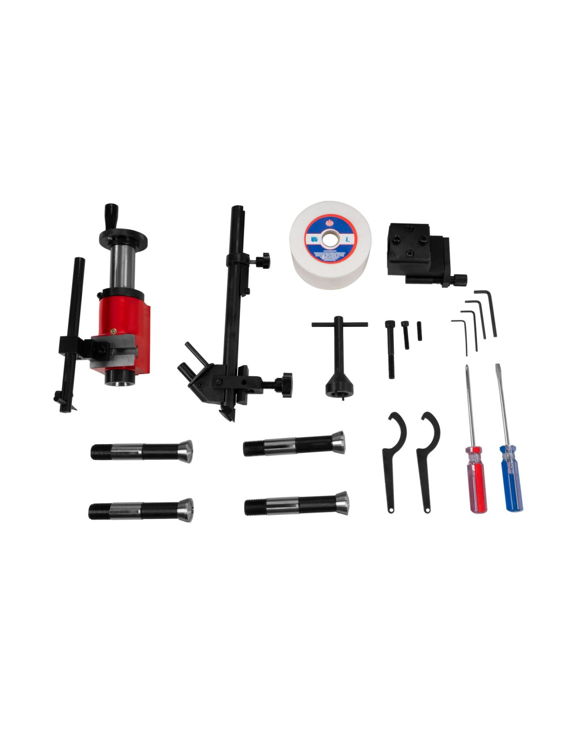 Universale grazie alle versatili opzioni di orientamento e regolazione per la rettifica di punzoni, punte elicoidali, elettrodi, utensili da tornitura, punte di centraggio, ecc. Elevata precisione grazie al corpo macchina robusto e al mandrino di rettifica di precisione privo di vibrazioni. Facile da usare e maneggiare. Ampia gamma di accessori standard: pinze di serraggio (4, 6, 8, 10, 12 mm), punta elicoidale, fresa e portautensili da tornitura, mola abrasiva in corindone, mola abrasiva diamantata, cinghia di trasmissione.