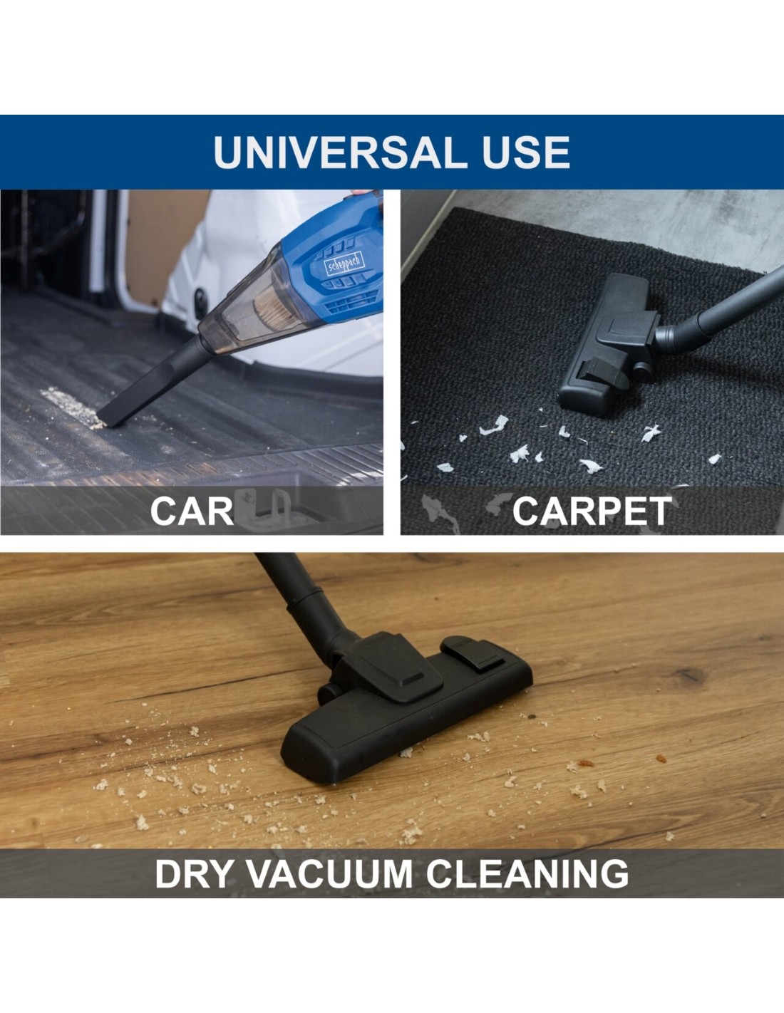 ASPIRAPOLVERE PORTATILE SENZA FILI - Aspirapolvere portatile per uso mobile, 10 kPa per una pulizia rapida ed efficiente anche dello sporco più importante - Lavoro senza fili con la serie Scheppach IXES 20 Volt - tutte le batterie e i caricabatterie di questa serie di sistemi possono essere combinati con l'aspirapolvere portatile senza fili - Stoccaggio salvaspazio, grazie all'incavo integrato per il supporto a parete - Grande raccoglitore di polvere con una capacità di 560 ml - Il design compatto consente uno stoccaggio salvaspazio - Comodo pavimento pulizia grazie a 3 tubi di prolunga aggiuntivi in plastica e bocchetta per pavimenti - La pratica impugnatura con impugnatura morbida consente una postura di lavoro ergonomica - Il filtro piegato di classe F9 filtra anche le minuscole particelle di polvere - Il filtro può essere pulito sotto l'acqua corrente - Batteria e caricabatterie disponibili separatamente - Include bocchetta per fessure, bocchetta per tappezzeria, bocchetta per pavimenti, 3 tubi di prolunga in plastica