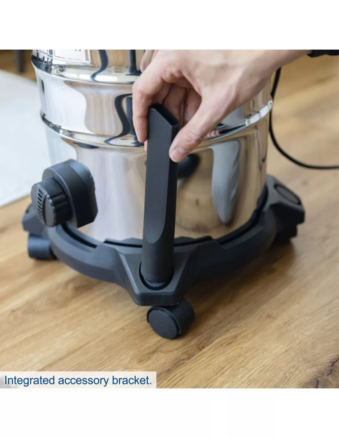 ASPIRATORE SOLIDI / LIQUIDI DA 30 L • Aspiratore solidi/liquidi compatto, 20 kPa per aspirazione solidi e aspiraliquidi a secco, con funzione soffio d'aria • Robusto raccoglitore in acciaio inox anticorrosivo con una capacità di 30 litri e blocco a sgancio rapido che consente una facile sostituzione del sacco • Potente motore elettrico da 1.200 W • Ampio raggio di lavoro, grazie al cavo di collegamento di 3 m e alla lunghezza del tubo flessibile di 2 m • Pratico supporto per accessori per garantire uno stivaggio ordinato e ordinato lavoro - La maniglia e le 4 ruote lisce a 360° consentono un facile trasporto - Include tubo di aspirazione da 2 m, 3 prolunghe in plastica da 33 cm, sacchetto di carta (certificato FSC), filtro in schiuma, bocchetta per fessure, bocchetta per pavimenti