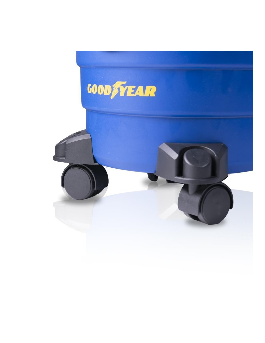 Questo aspirapolvere con cavo senza sacchetto di Goodyear, ovviamente, è dotato di ruote di trasporto sterzanti.