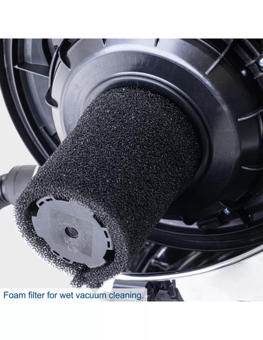 ASPIRATORE SOLIDI / LIQUIDI DA 25 L • Aspiratore umido/secco compatto, 20 kPa per aspirazione solidi e aspiraliquidi a secco, con funzione soffio d'aria • Robusto raccoglitore in acciaio inox anticorrosivo con una capacità di 25 litri e blocco a sgancio rapido che consente una facile sostituzione del sacco • Potente motore elettrico da 1.200 W • Ampio raggio di lavoro, grazie al cavo di collegamento di 3 m e alla lunghezza del tubo flessibile di 2 m • Pratico supporto per accessori per garantire uno stivaggio ordinato e ordinato - La maniglia e le 4 ruote lisce a 360° consentono un facile trasporto - Include un tubo di aspirazione da 2 m, 3 prolunghe in plastica da 33 cm, p