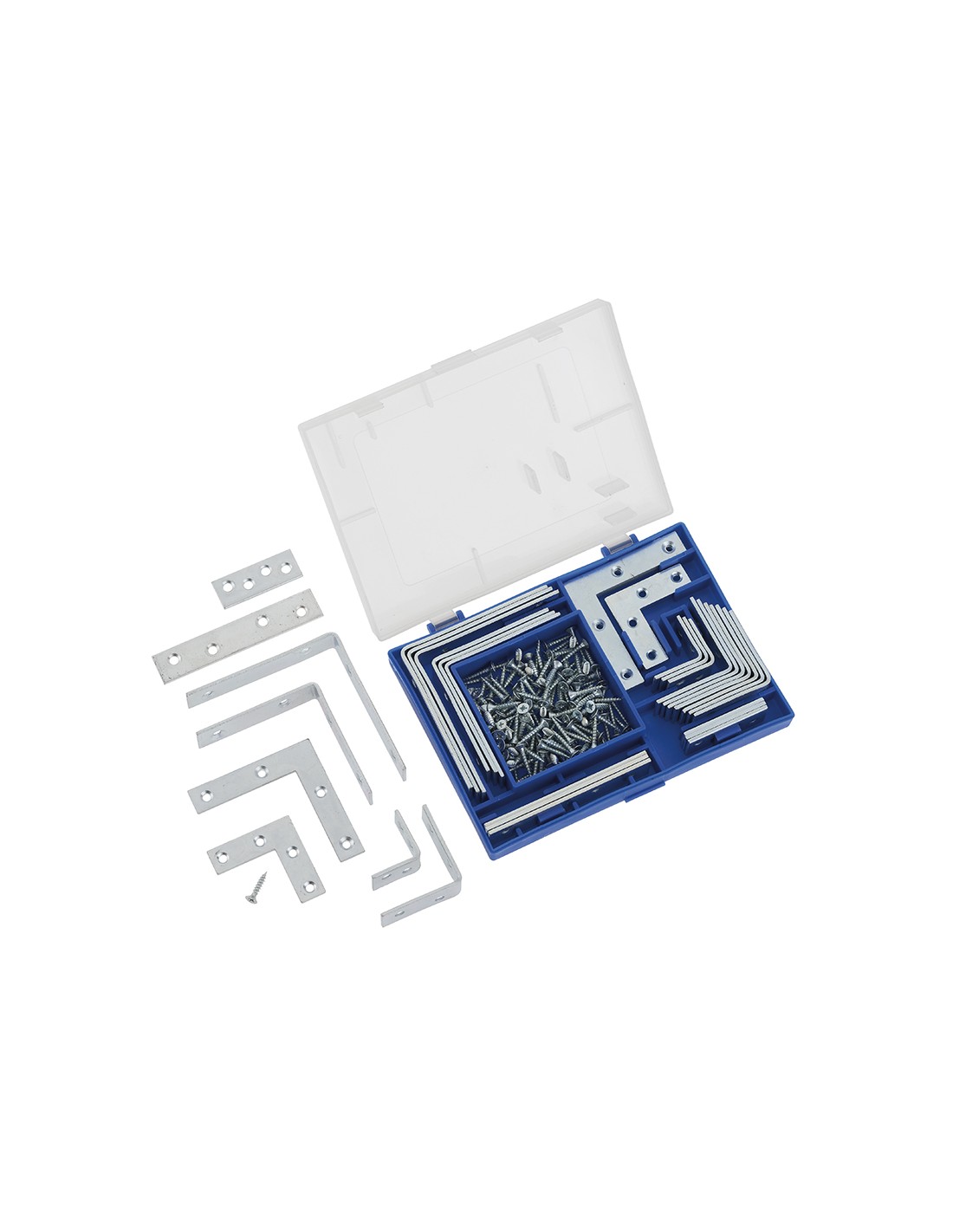 4 Pz staffe ad angolo: 25×25×16×2,0mm 8 Pz staffe ad angolo: 40×40×16×2,0mm 4 Pz staffe ad angolo: 60×60×16×2,0mm 4 Pz staffe ad angolo: 75×75×16×2,0mm 4 Pz staffe piatte a L: 40×40×12×2,0mm 4 Pz staffe piatte a L: 60×60×12×2,0mm 4 Pz staffe piatte: 80×15×2,0mm 4 Pz staffe piatte: 40×15×2,0mm 144 Pz viti: 3×16mm. Questo set contiene in totale 180 pezzi realizzando in acciaio resistente. Grazie a questo ste sia hobbisti che professionisti possono compiere varie attività di montaggio, tra cui l’unione di oggetti, in tutta sicurezza in maniera precisa. La varietà delle misure offre all'utilizzatore un’ampia gamma di scelta. Le staffe vengono confezionate in una pratica scatola di plastica.