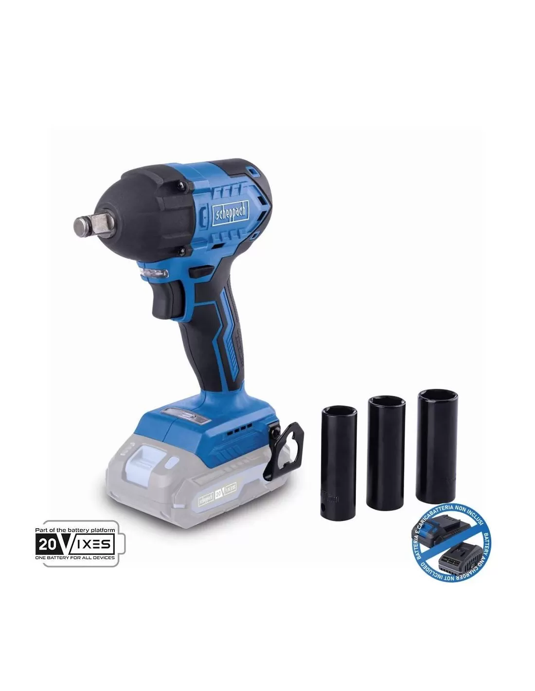 - Lavoro senza fili con la serie Scheppach IXES da 20 volt: tutte le batterie e i caricabatterie della serie possono essere combinati con l'avvitatore a impulsi a batteria