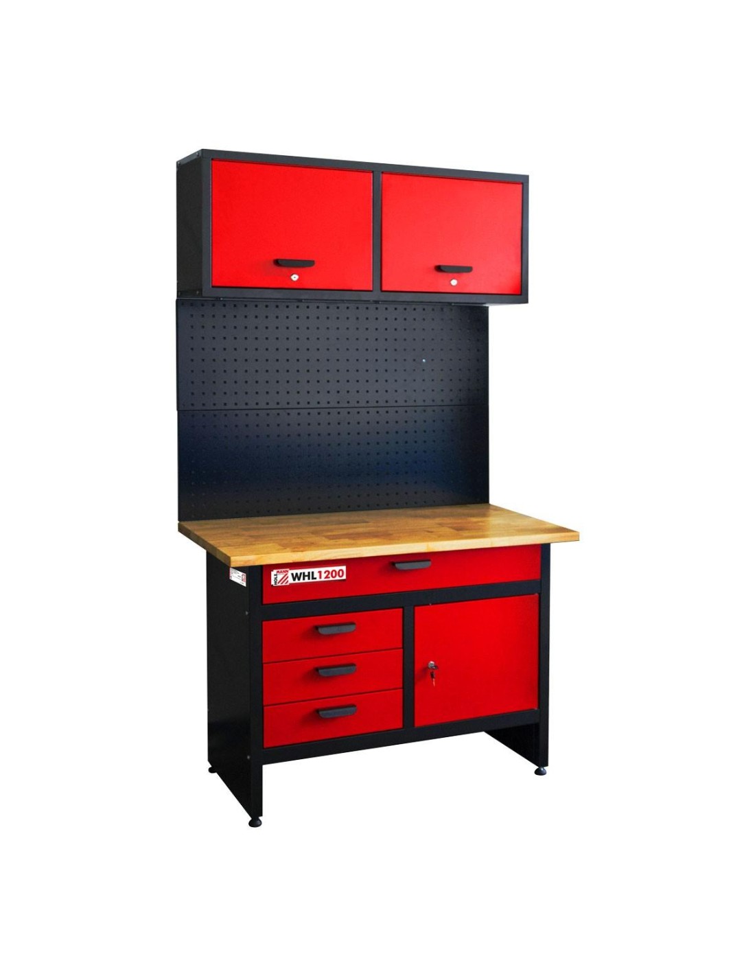 Banco da lavoro di costruzione robusta, dotato di 3 cassetti piccoli, un cassettone, un mobile inferiore e due armadietti superiori chiudibili a chiave.