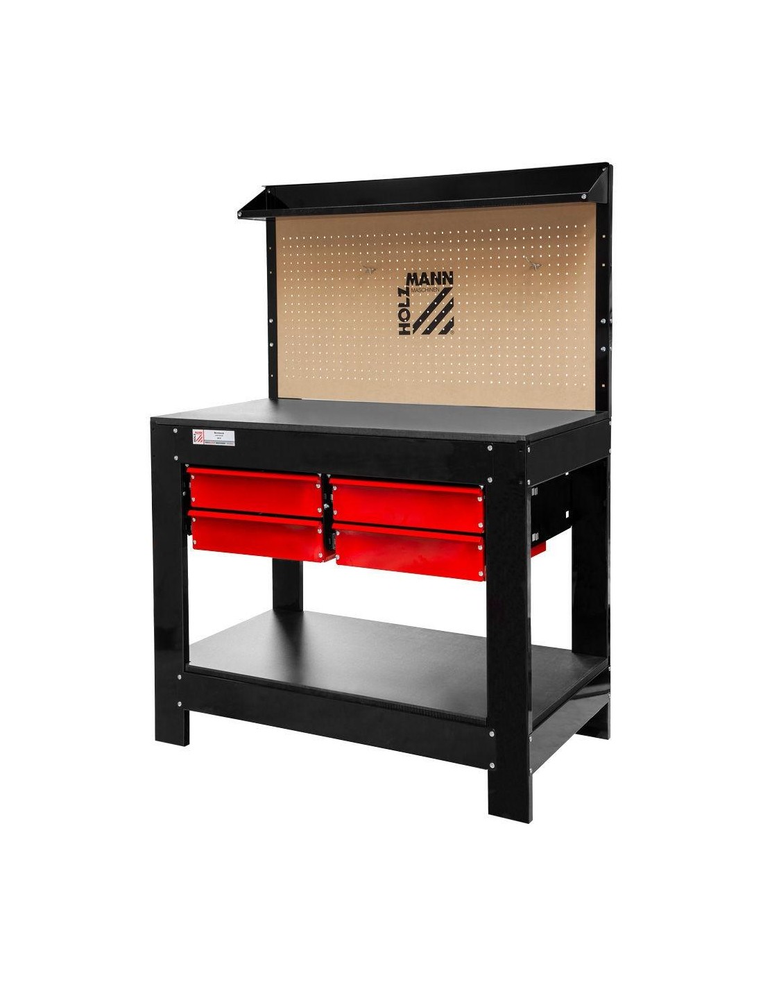 Banco con ampio piano di lavoro in MDF, posizionato su una robusta struttura in lamiera.