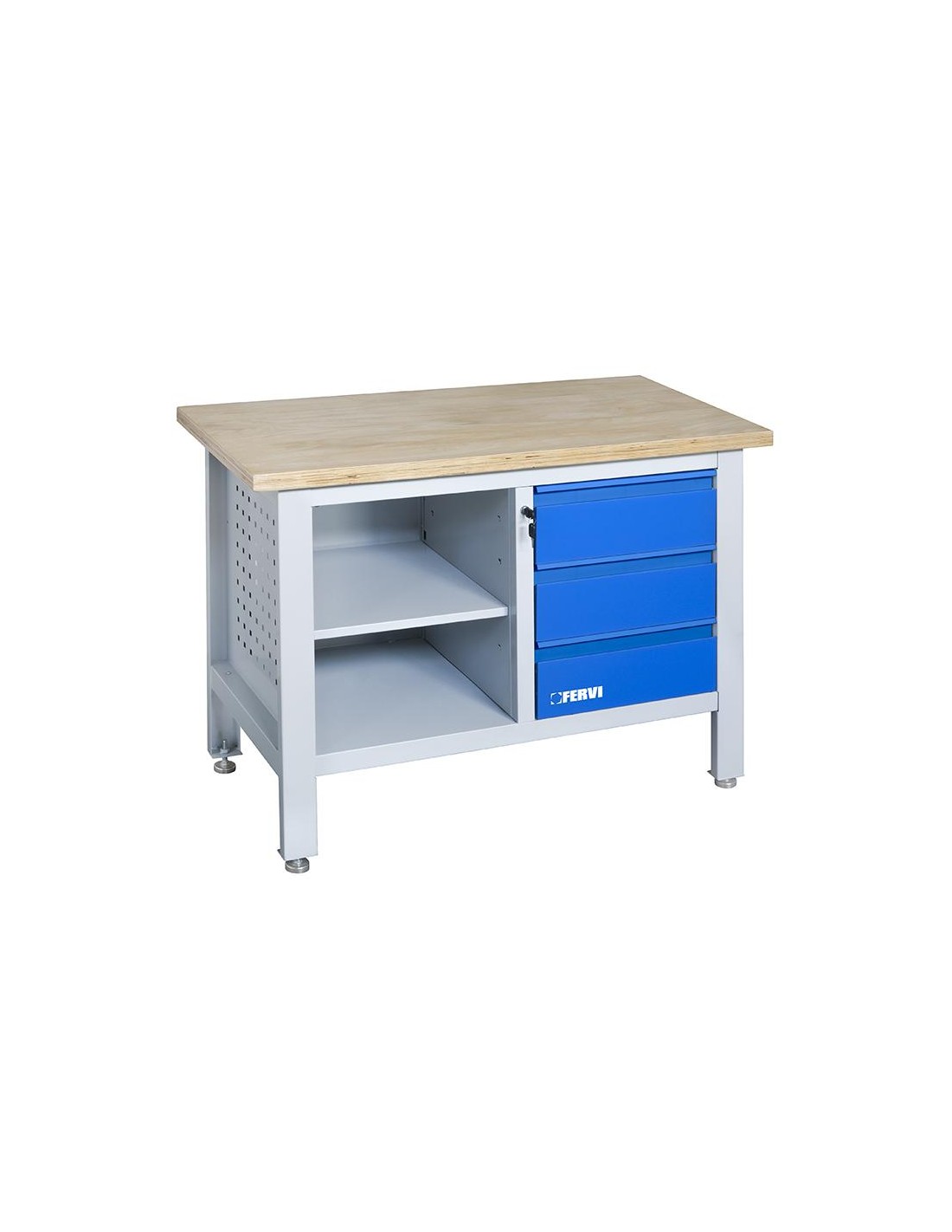 Con piano in legno pressato, 3 cassetti con chiave e ripiano, piedini regolabili