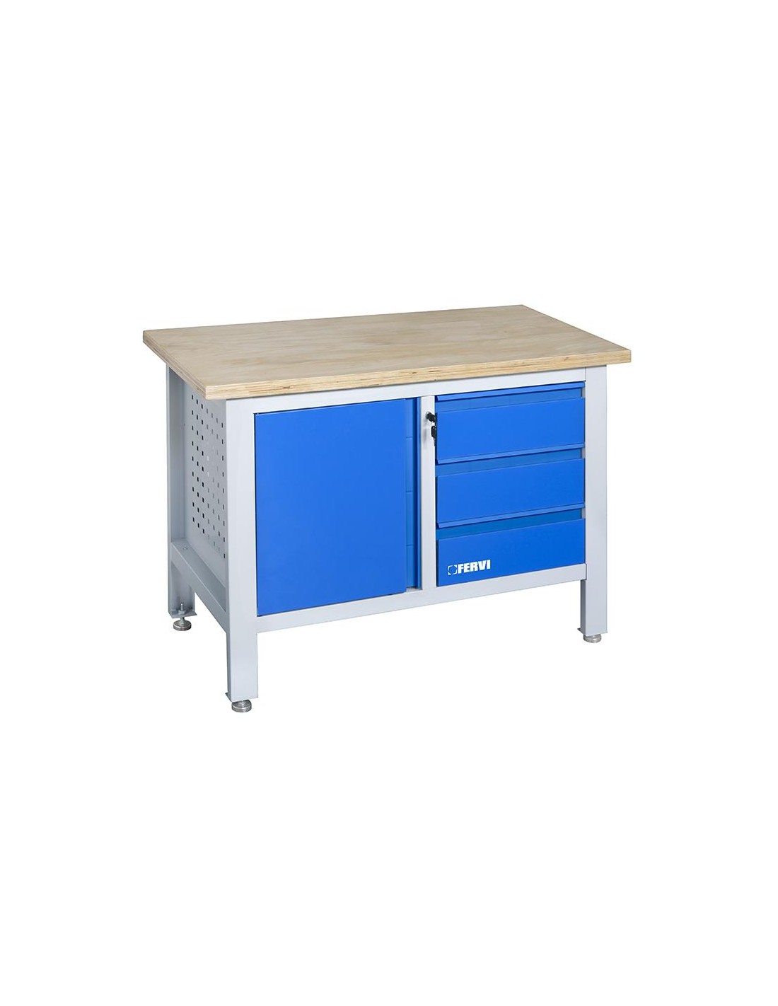 Con piano in legno pressato, 3 cassetti con chiave e anta con ripiano, piedini regolabili