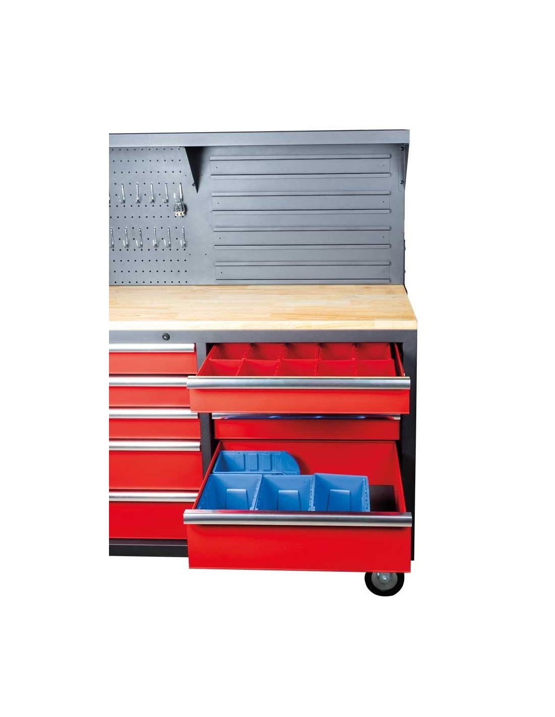 Incluso nella consegna : 10 contenitori piccoli (165 x 105 x75 mm), 4 contenitori grandi (240 x 150 x125 mm), 30 ganci per pannello forato, tappetino in gomma (spessore 3 mm)