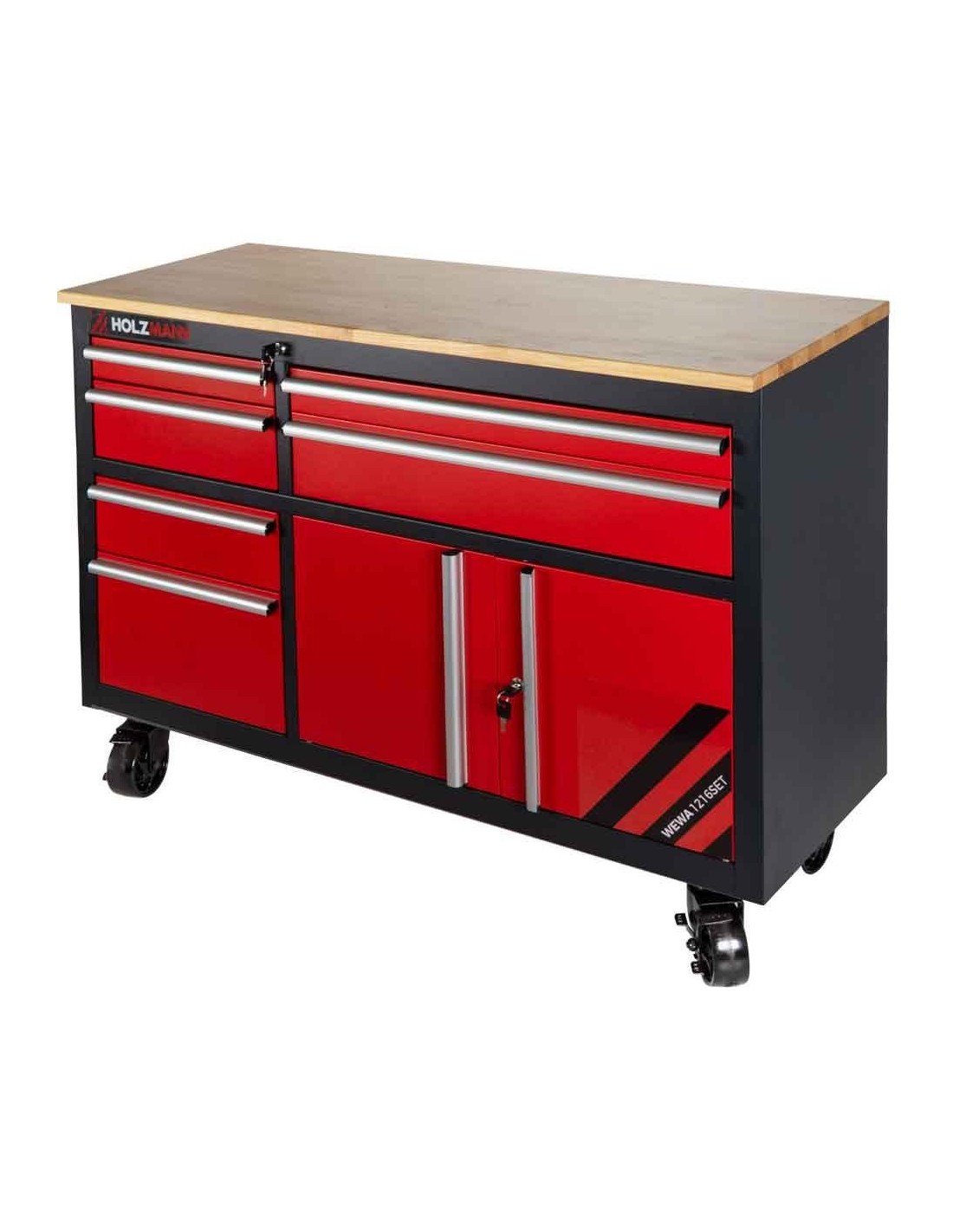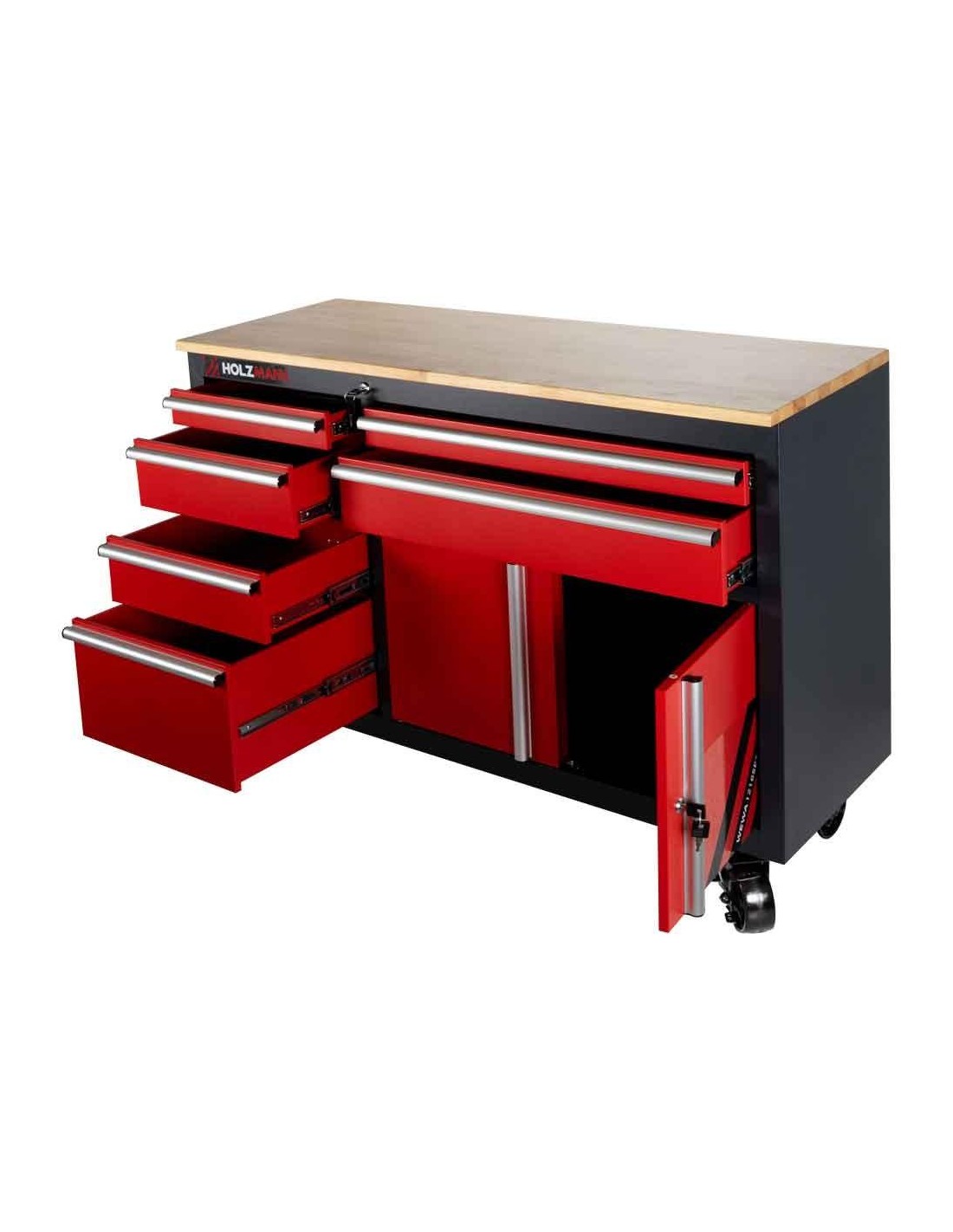 Il SET banco da lavoro-carrelliera HOLZMANN comprende un solido banco da lavoro e un carretto con 6 cassetti, un mobiletto e un piano di lavoro in legno. L'armadio a rotelle può essere riposto sotto il banco da lavoro, è dotato di serratura e dispone di due ruote piroettanti con freno.