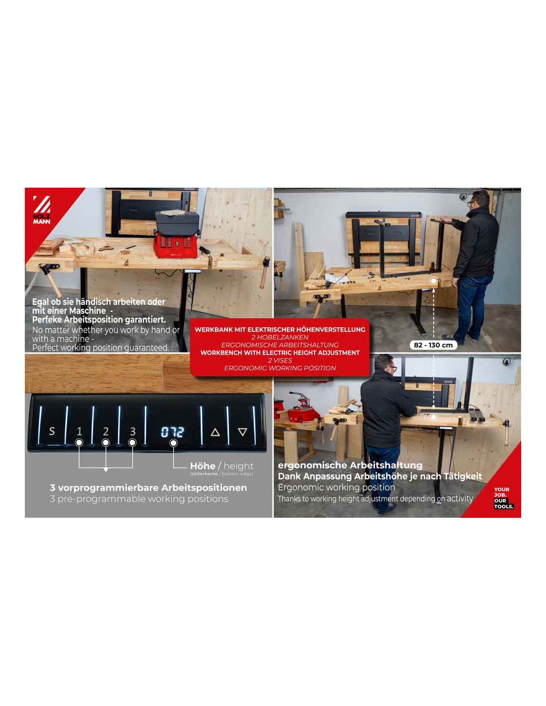 La HOLZMANN WB210ELIFT_230V è un vero gioiello per ogni appassionato di officina! Il piano di lavoro regolabile in altezza garantisce un comfort ergonomico, mentre i due motori e il pannello di controllo con tre posizioni di lavoro pre-programmabili ne rendono l'utilizzo estremamente semplice. I robusti morsetti da banco e il solido piano di lavoro in legno di caucciù non solo garantiscono stabilità, ma anche un ambiente di lavoro piacevole. Lavorare diventa così doppiamente divertente!