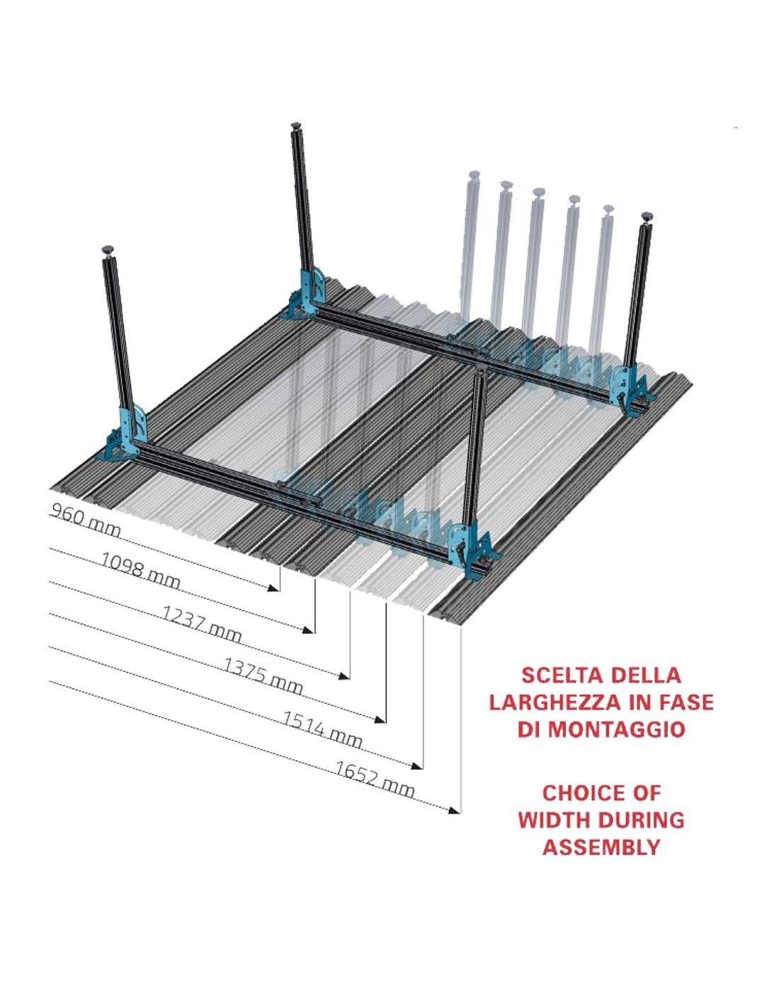 Lunghezza 180 cm e larghezza configurabile da 96 a 165 cm in alluminio.