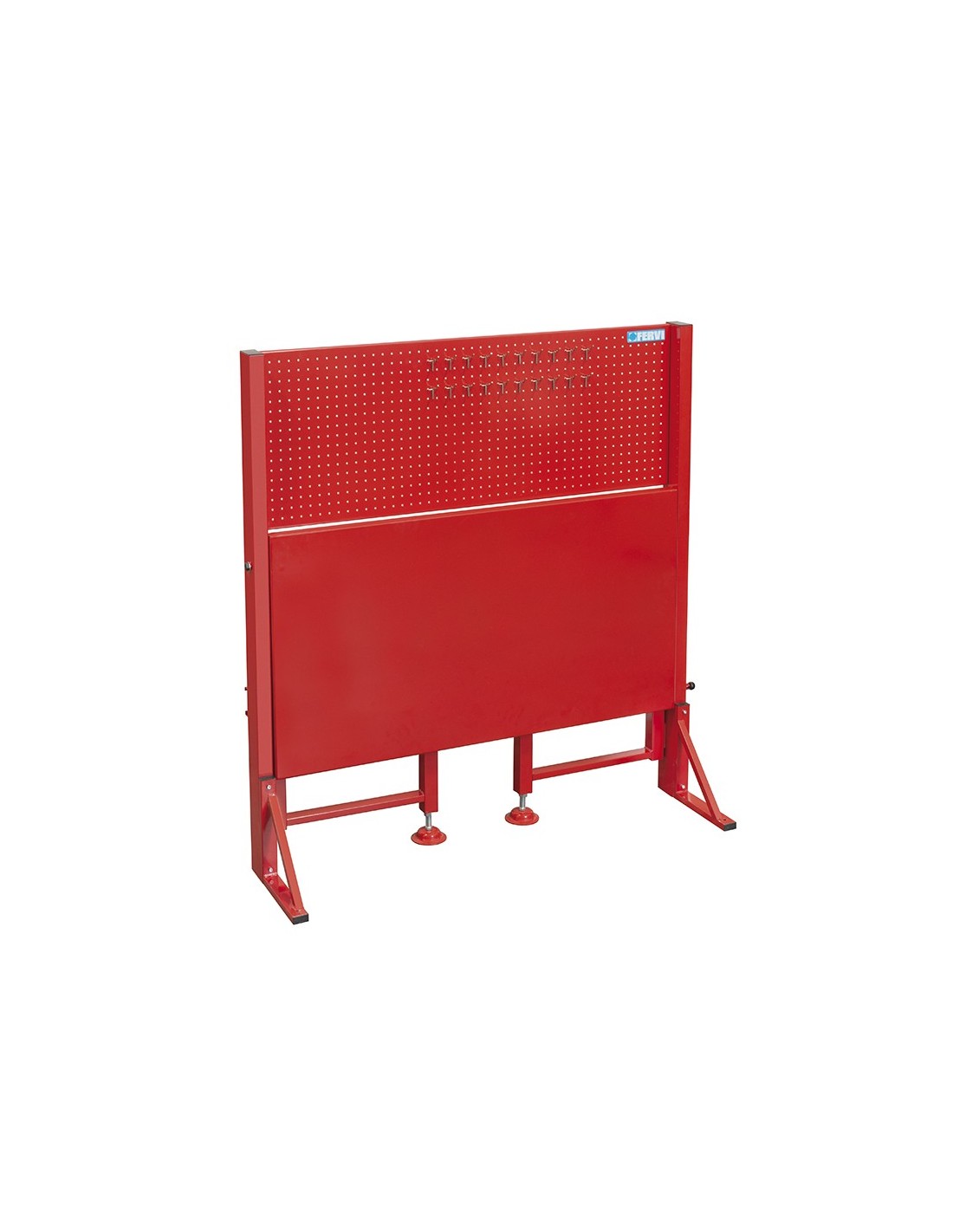 Con piano richiudibile aiutato da 2 ammortizzatori ad aria, pannello porta attrezzi 1195 x 458 x 20 mm, altezza massima 1380 mm, larghezza massima 1280 mm, profondità banco aperto 648 mm, profondità banco chiuso 130 mm ad un'altezza di 330 mm, bloccaggi per piano aperto e chiuso, pannello con fori ø 4 mm, interasse fori 25 mm per ganci con filo di ø 3 mm.