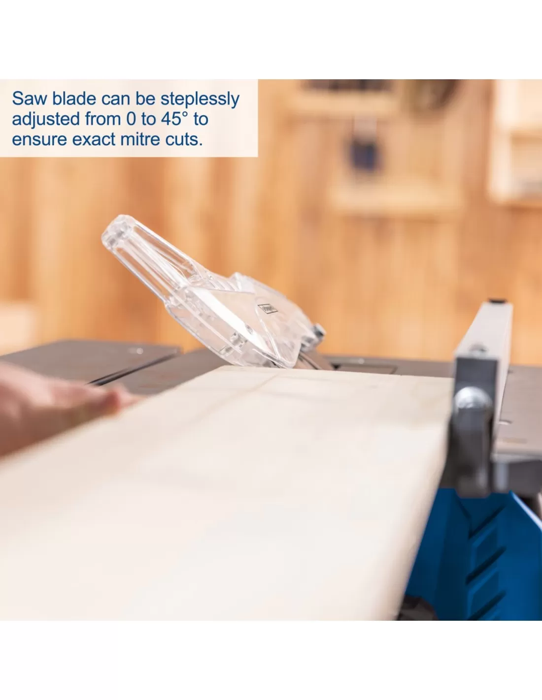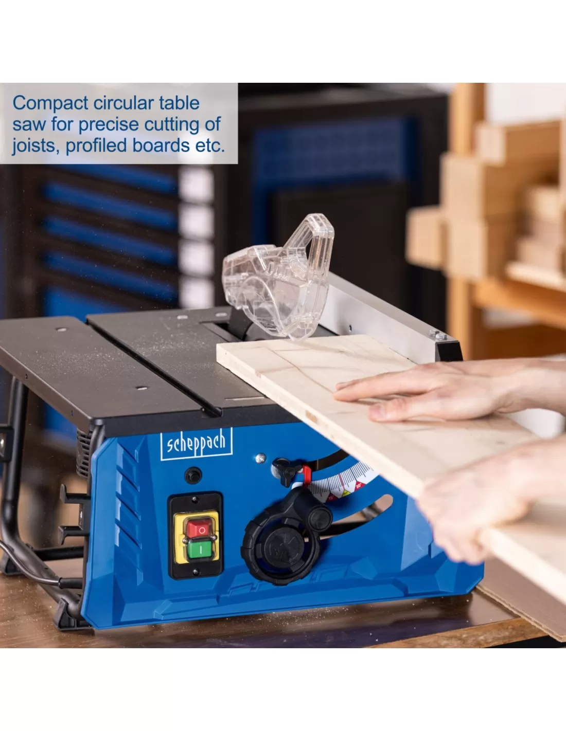 SEGA CIRCOLARE DA BANCO DA 210 MM • Sega circolare compatta per il taglio preciso di travi, profilati in legno, nonché tagli longitudinali e obliqui • Potente motore da 1500 W con interruttore automatico di sovraccarico • Volantino per un comfort ottimale dell'altezza di taglio • Collegamento integrato per l'aspirazione esterna • Lama inclinabile in continuo da 0 a 45° per tagli angolati precisi • Altezza di taglio a max. 90° 70 mm / max. 45° 54 mm - Design compatto - ideale per l'uso mobile - Guida angolare regolabile da -60° a +60°, ideale per tagli obliqui - Guida parallela a doppio morsetto con righello graduato per tagli longitudinali particolarmente precisi - Lama Ø 210 mm con 4800 min-1 per risultati di taglio di precisione - Massima sicurezza di lavoro grazie alla protezione della lama - Fornito con guida angolare, una guida parallela e uno spintore