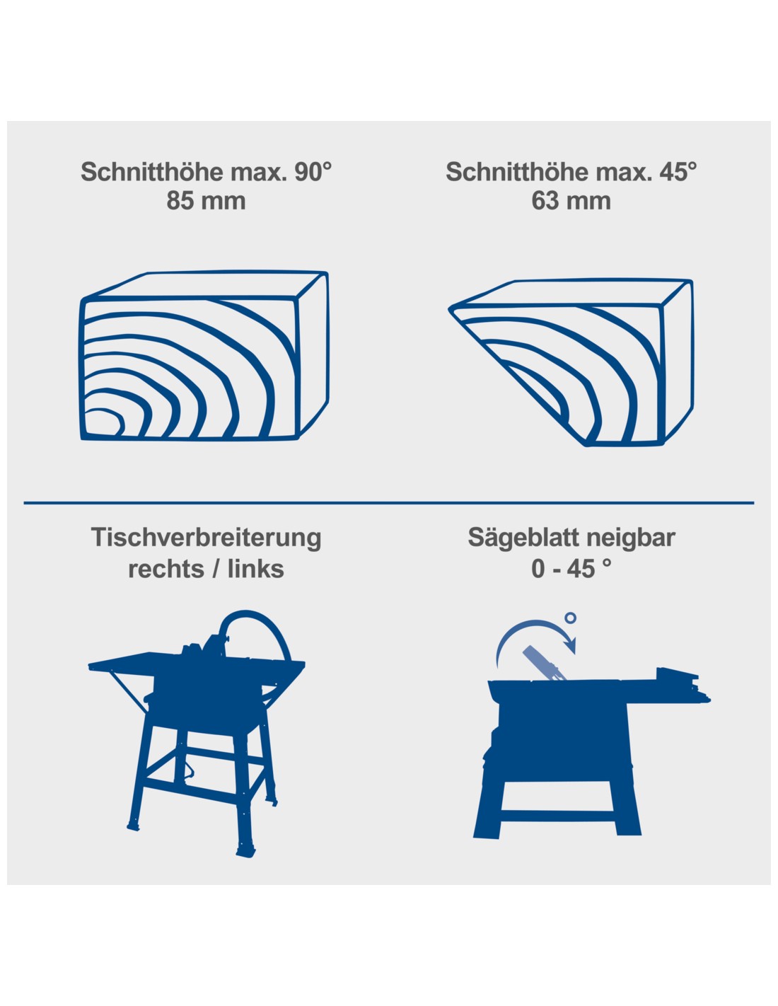 • Altezza di taglio a 90° max. 85 mm; a 45° fino a max. 63 mm