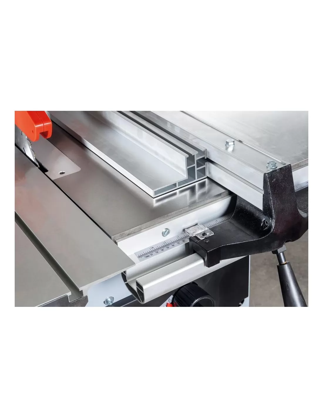 Il prodotto è dotato di una guida goniometrica estraibile inclinabile sia a destra che a sinistra fino a 45° e di una guida parallela con morsetto a sgancio rapido.