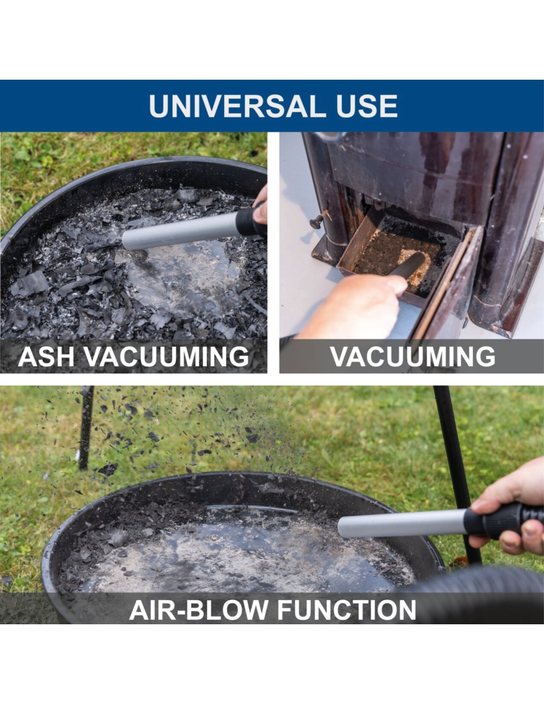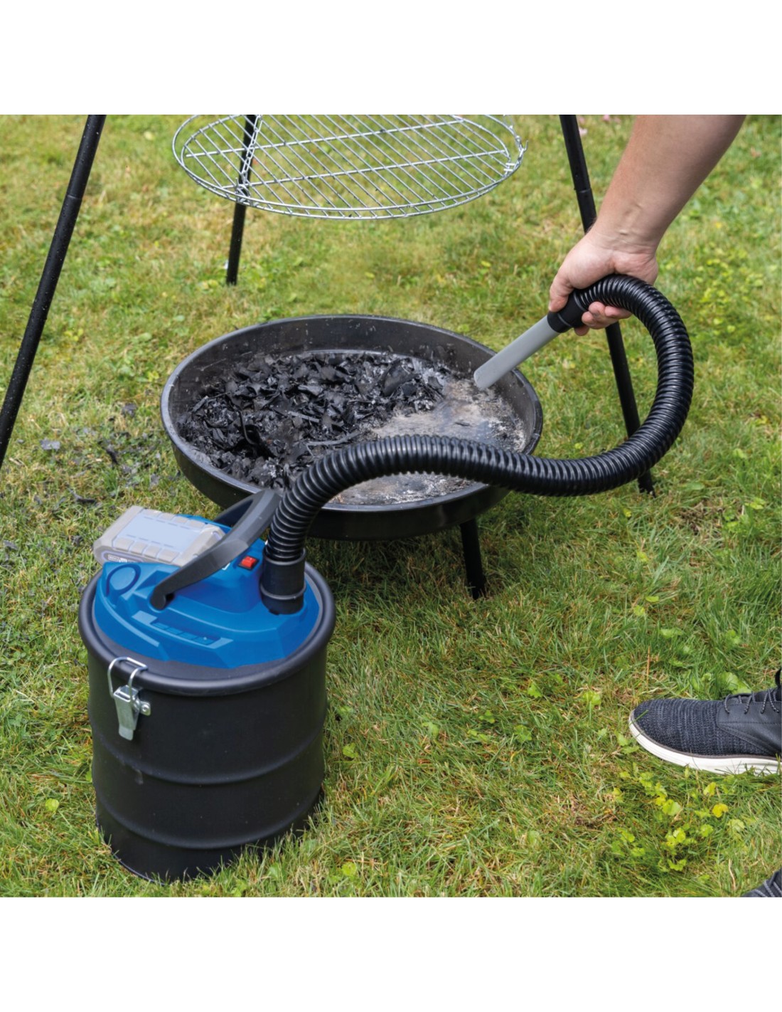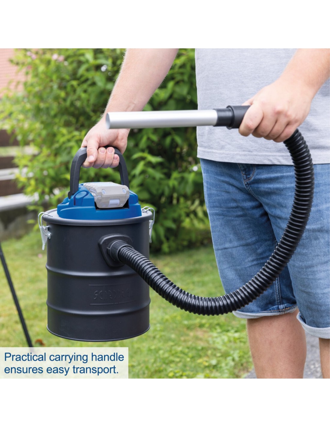 ASPIRACENERE A BATTERIA DA 15 L • Aspiracenere compatto, con una capacità di aspirazione di 10 kPa, garantisce una stufa a legna o un barbecue puliti • Lavoro senza fili con la serie Scheppach IXES 20 Volt – tutte le batterie e i caricabatterie di questa serie di sistemi possono essere combinati con l'aspiracenere a batteria • Robusto raccoglitore in metallo con capacità di 15 L • Ampio raggio di lavoro, grazie al tubo in alluminio ignifugo da 230 mm e al tubo di aspirazione da 1000 m - Attacco per soffiaggio per aree di soffiaggio di difficile accesso - Filtro piegato per sporco grossolano e cenere - Il blocco a sgancio rapido consente un facile svuotamento del raccoglitore - La pratica maniglia per il trasporto garantisce un facile trasporto