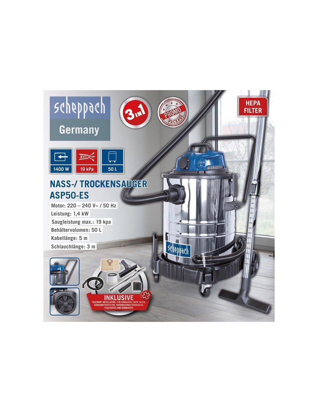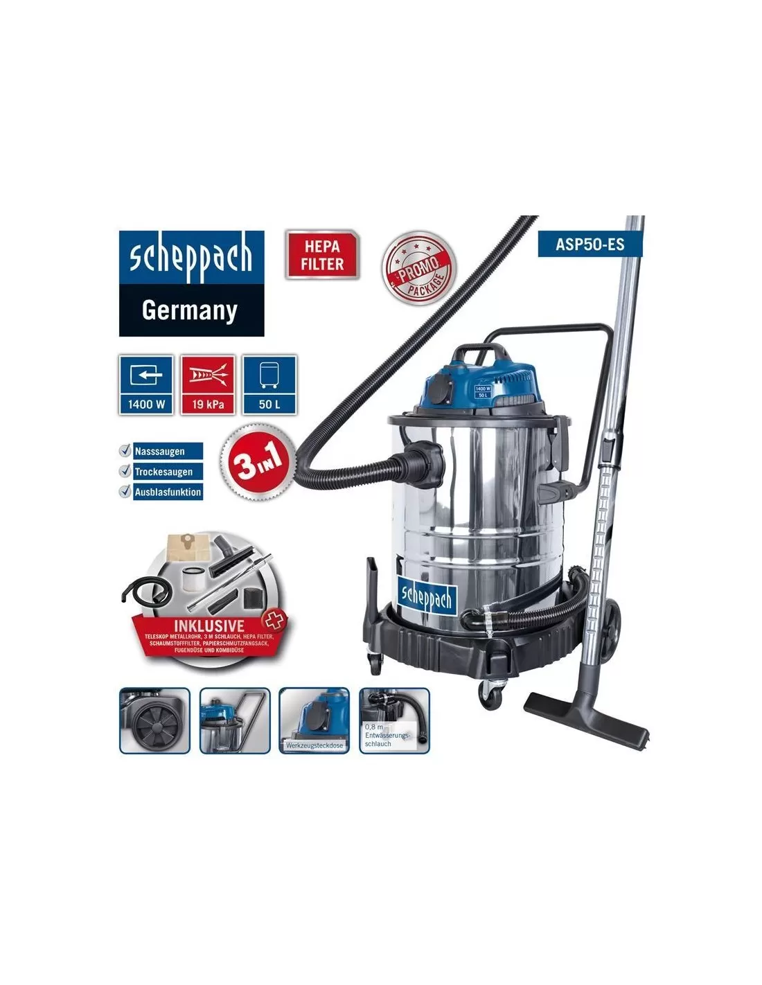 ASPIRATORE ASPIRAPOLVERE ASPIRALIQUIDI BIDONE INOX 1400W 50L SCHEPPACH ASP50-ES
