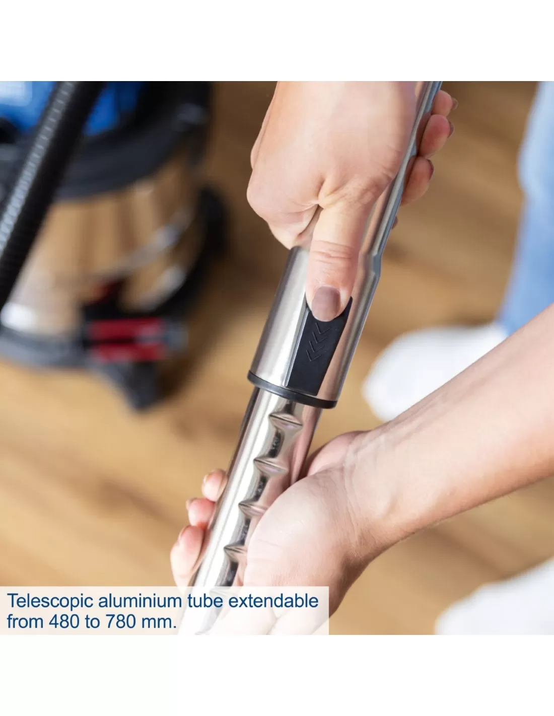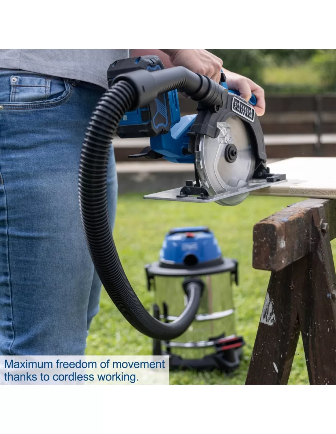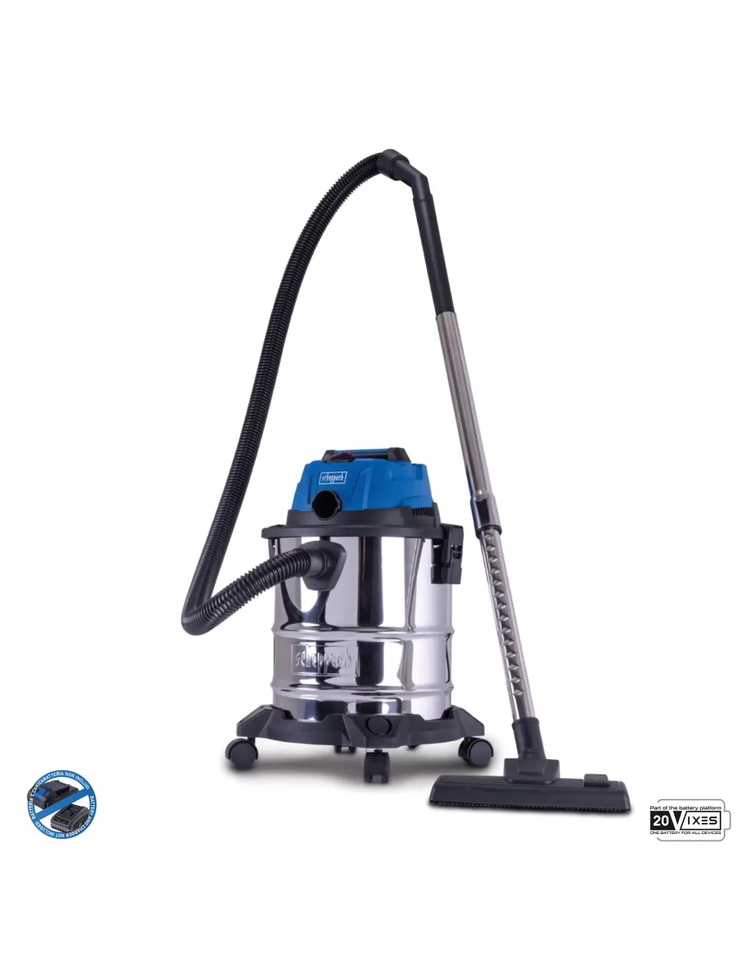ASPIRAPOLVERE UMIDO/SECCO SENZA FILI DA 20 L • Aspirapolvere umido/secco compatto, 10 kPa per l'aspirazione di liquidi e l'aspirapolvere a secco, con funzione di soffiaggio d'aria • Lavoro senza fili con la serie Scheppach IXES 20 Volt – tutte le batterie e i caricabatterie di questa serie di sistemi possono essere combinati con l'aspirapolvere umido/secco senza fili • Robusto raccoglitore infrangibile con una capacità di 12 litri e blocco a sgancio rapido che consente una facile sostituzione del sacchetto • Filtro piegato lavabile filtra anche le particelle di polvere più piccole - Ampio raggio di lavoro, grazie alla lunghezza del tubo flessibile di 1,5 m e ai 3 tubi di prolunga aggiuntivi in plastica - Pratica staffa per accessori per garantire uno stivaggio pulito e un lavoro ordinato - L'impugnatura e le 4 ruote lisce a 360° consentono un facile trasporto - Batteria e caricabatterie disponibili separatamente - Include 3 tubi di prolunga in plastica, filtro piegato, sacchetto di carta (certificato FSC), filtro in schiuma, bocchetta per pavimenti, bocchetta per fessure, tubo di aspirazione