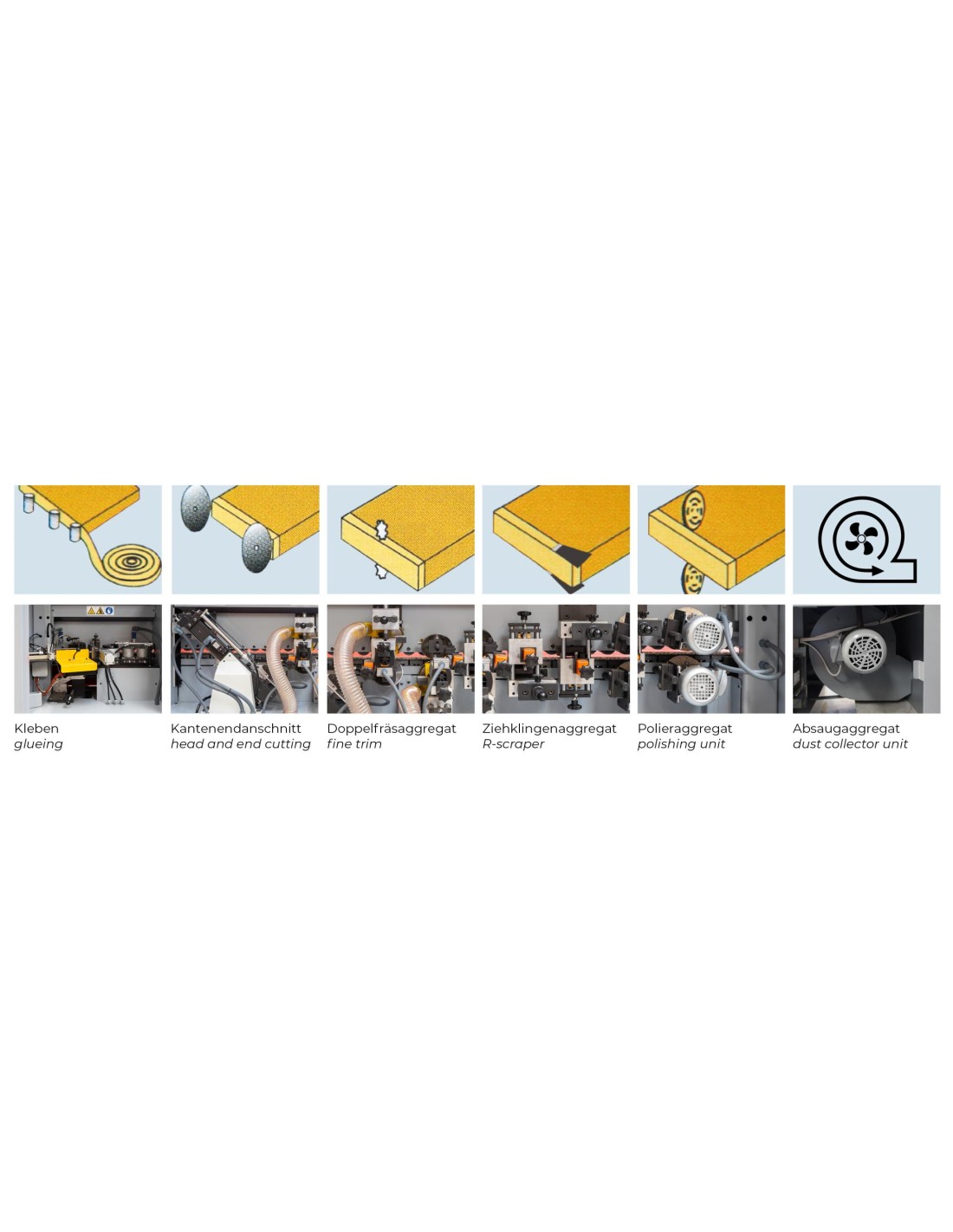 Dotazione: Macchina con 2 raschiatori, lame per l'unità di taglio trasversale (100 x 30 x 3,2 mm T30), fresa a raggio (49 x 20 mm T4); Dischi lucidanti (D. 150 mm)