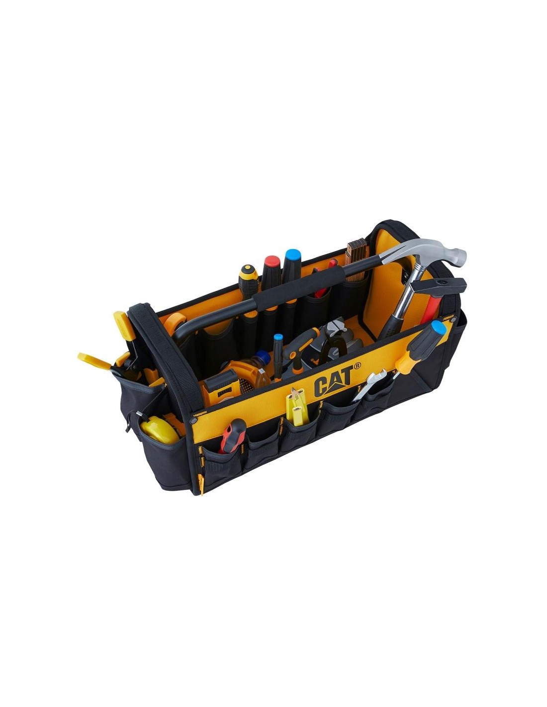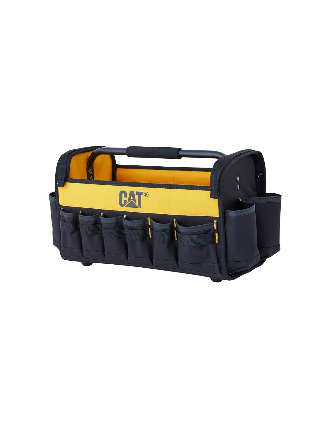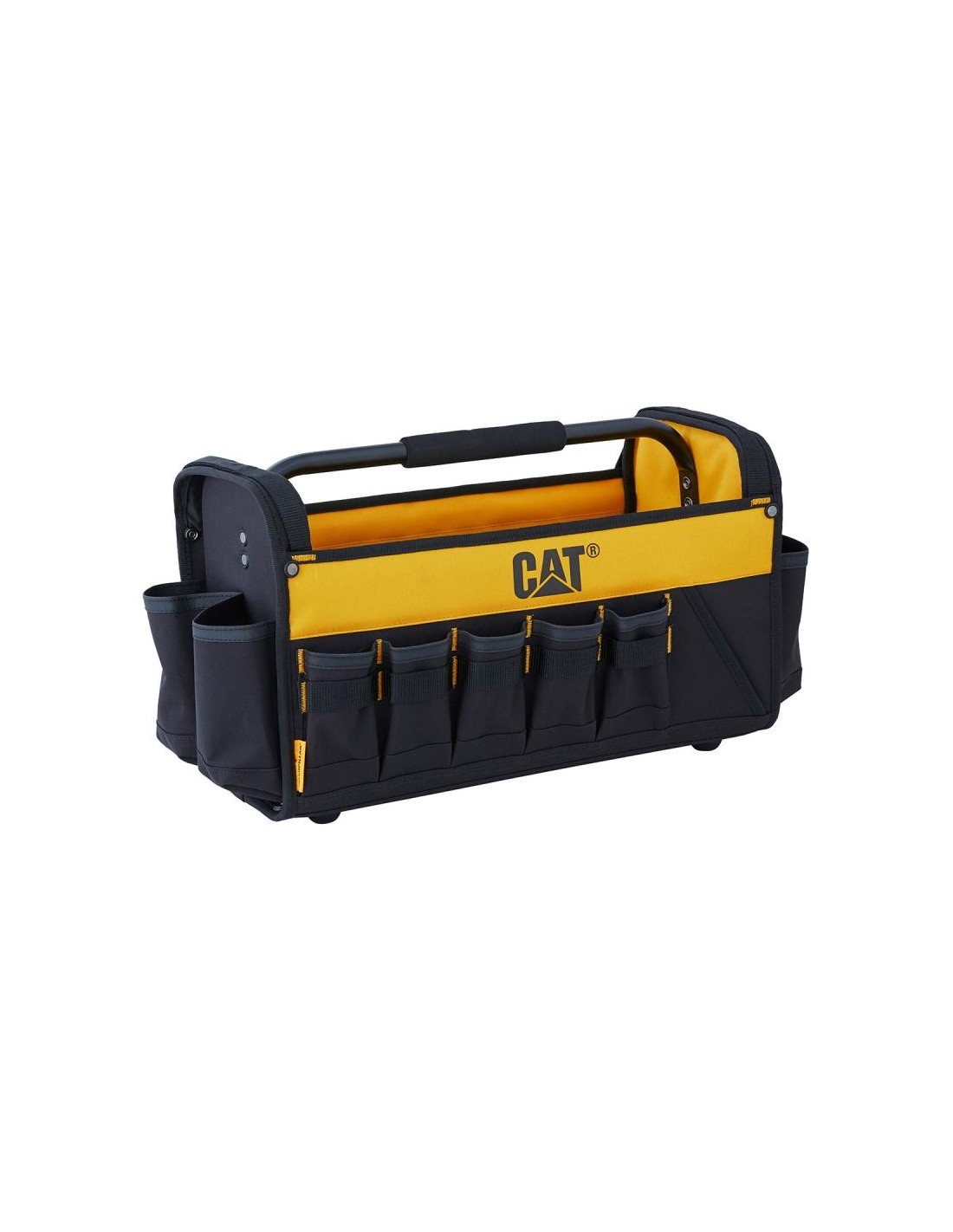 La borsa degli attrezzi CAT è realizzata in poliestere 600D con fodera in PVC, offrendo robustezza e resistenza. Ideale per i professionisti che necessitano di un'organizzazione efficiente e un facile accesso agli attrezzi.