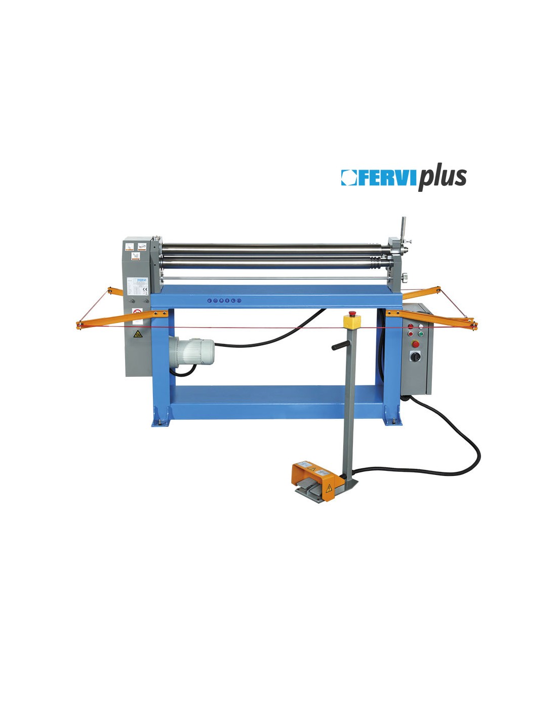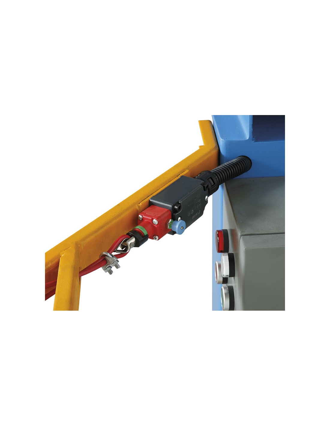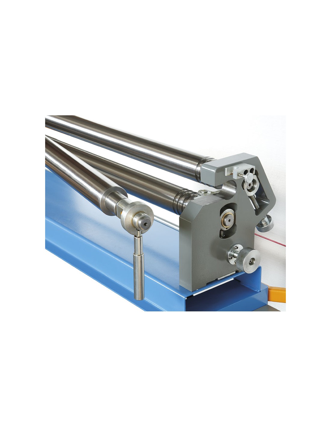 A 3 rulli in acciaio con durezza 52HRC, barriera di arresto di emergenza a filo con micro di sicurezza a 3 funzioni, comandi mobili con doppio pedale avanti/indietro e pulsante a fungo di arresto di emergenza.