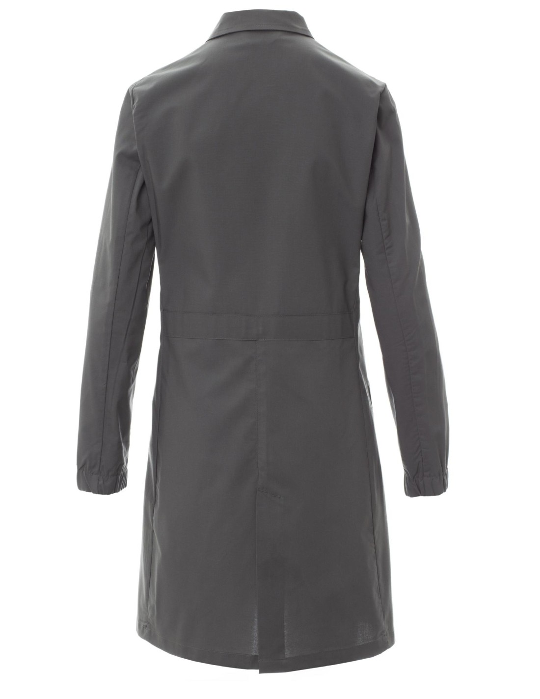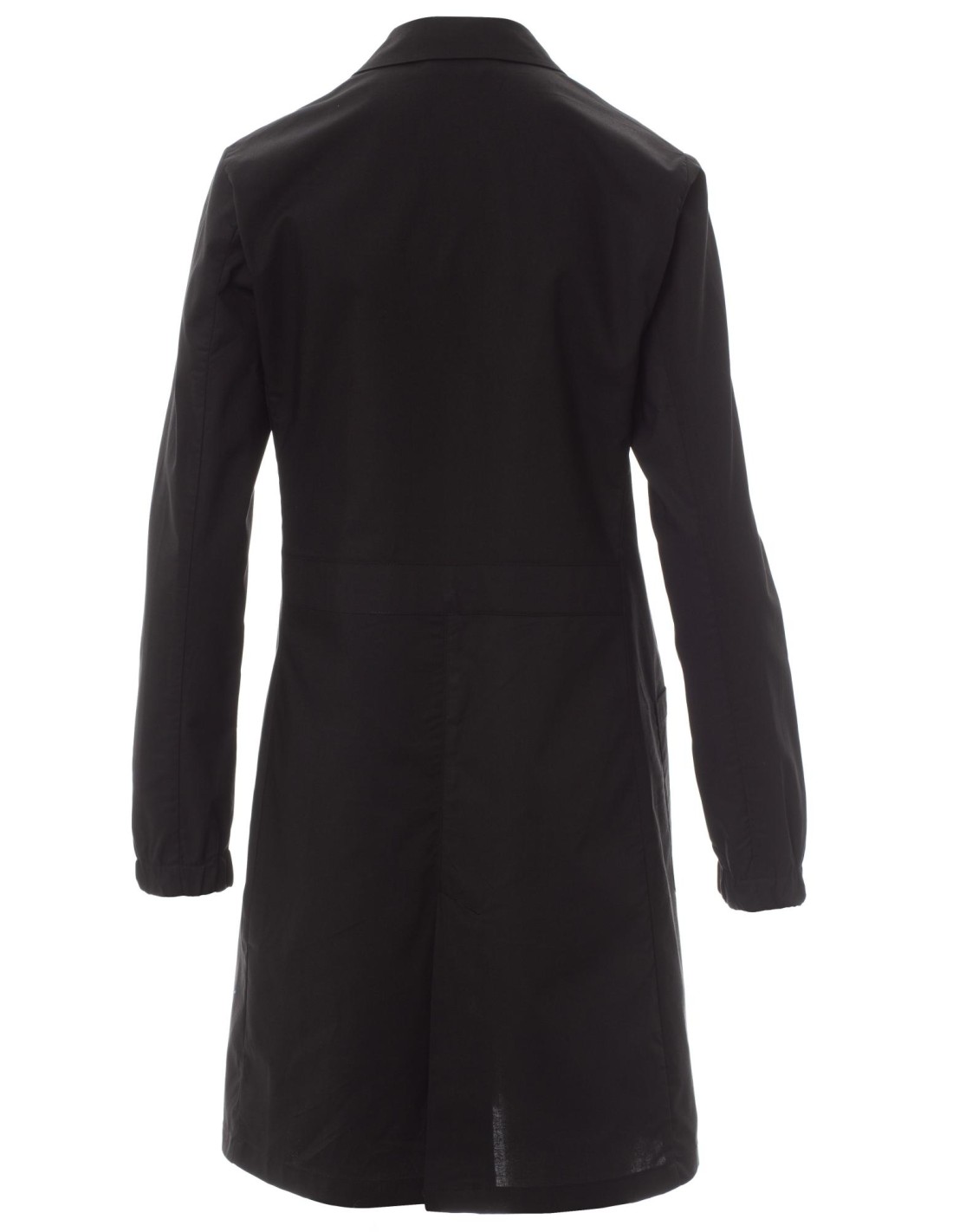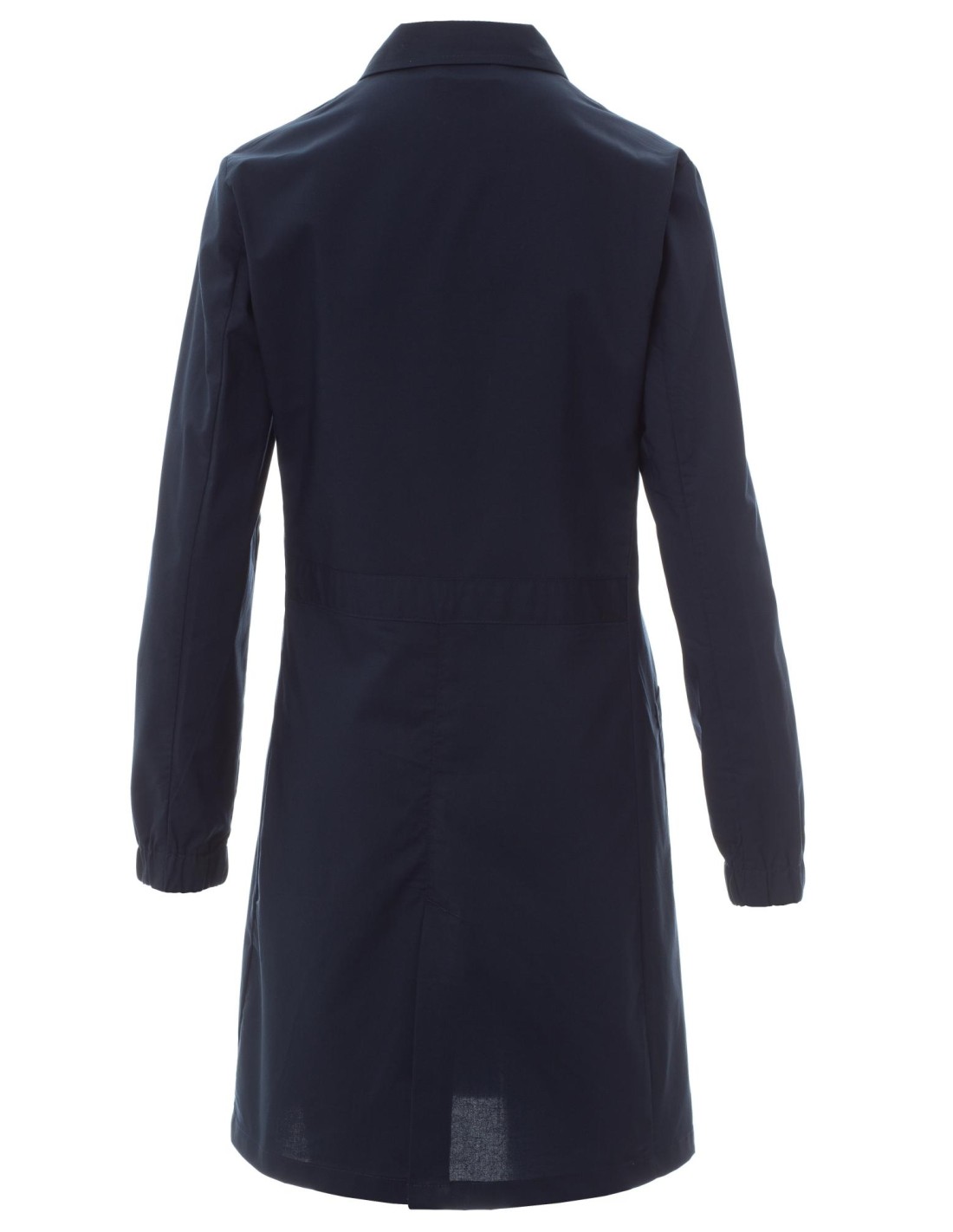 Camice da donna, con collo rever classico, chiuso sul davanti con bottoni automatici, abbottonatura coperta, una tasca applicata sul petto con scomparto porta-penna, due tasche applicate alla vita, un taschino per smartphone, carrè schiena liscio, spacco sul retro per agevolare i movimenti, maniche lunghe con elastici stringi polso