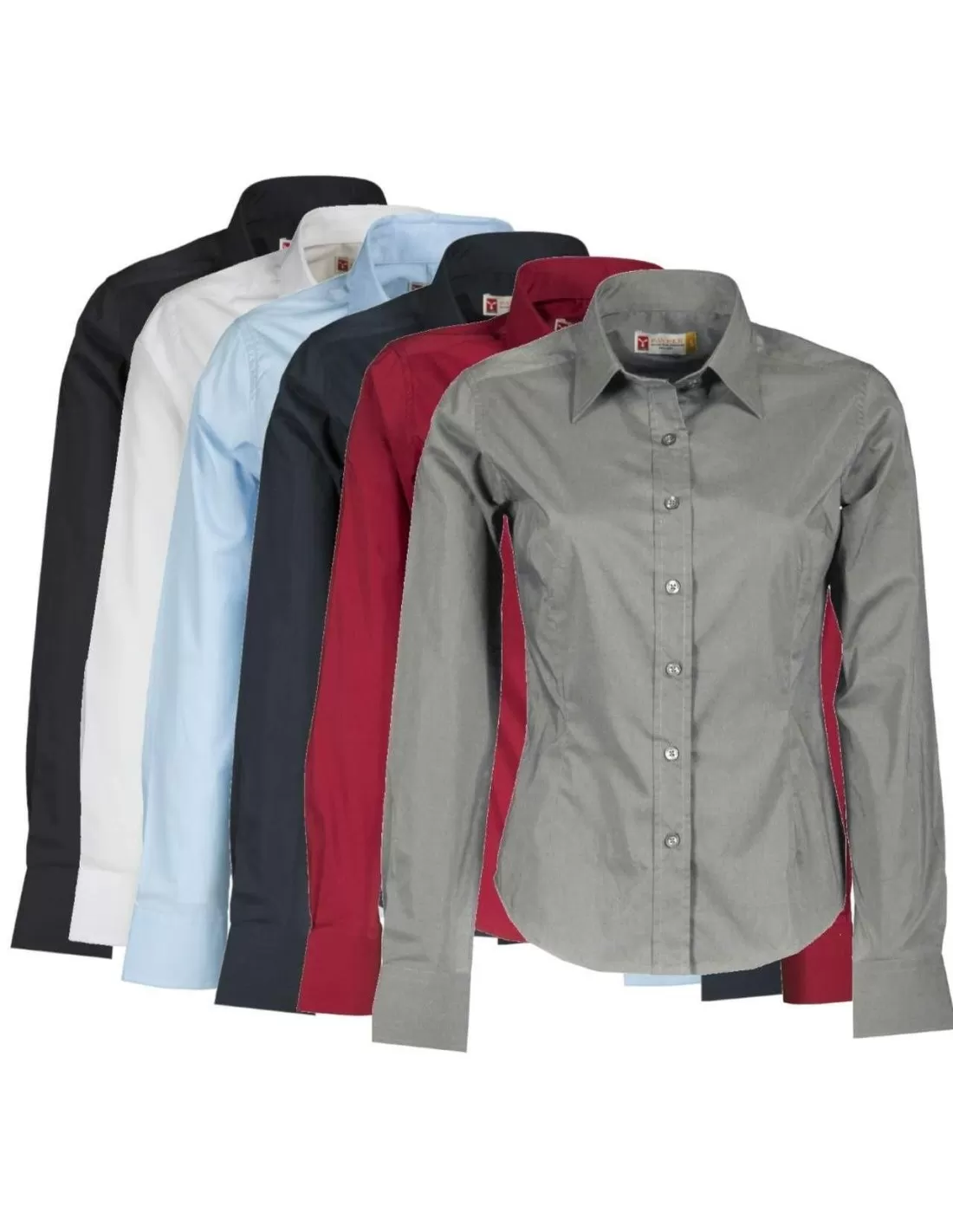 Camicia donna elasticizzata dal titolo finissimo pettinato, vestibilitŽá sfiancata, pinces di ripresa davanti e dietro, colletto modello italiano, polso sagomato a due bottoni e un asola, davanti con cannoncino cucito a vista e bottone in tinta; dietro liscio con carrŽ¿. Trattamento easy care del tessuto.
