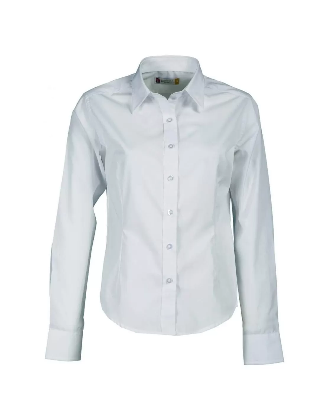 Camicia donna dal titolo finissimo di cotone pettinato, vestibilità sfiancata, pinces di ripresa davanti e dietro, colletto modello italiano, polso sagomato a due bottoni e un asola, davanti con cannoncino cucito a vista e bottone in tinta; dietro con carrè. Trattamento easy care del tessuto.