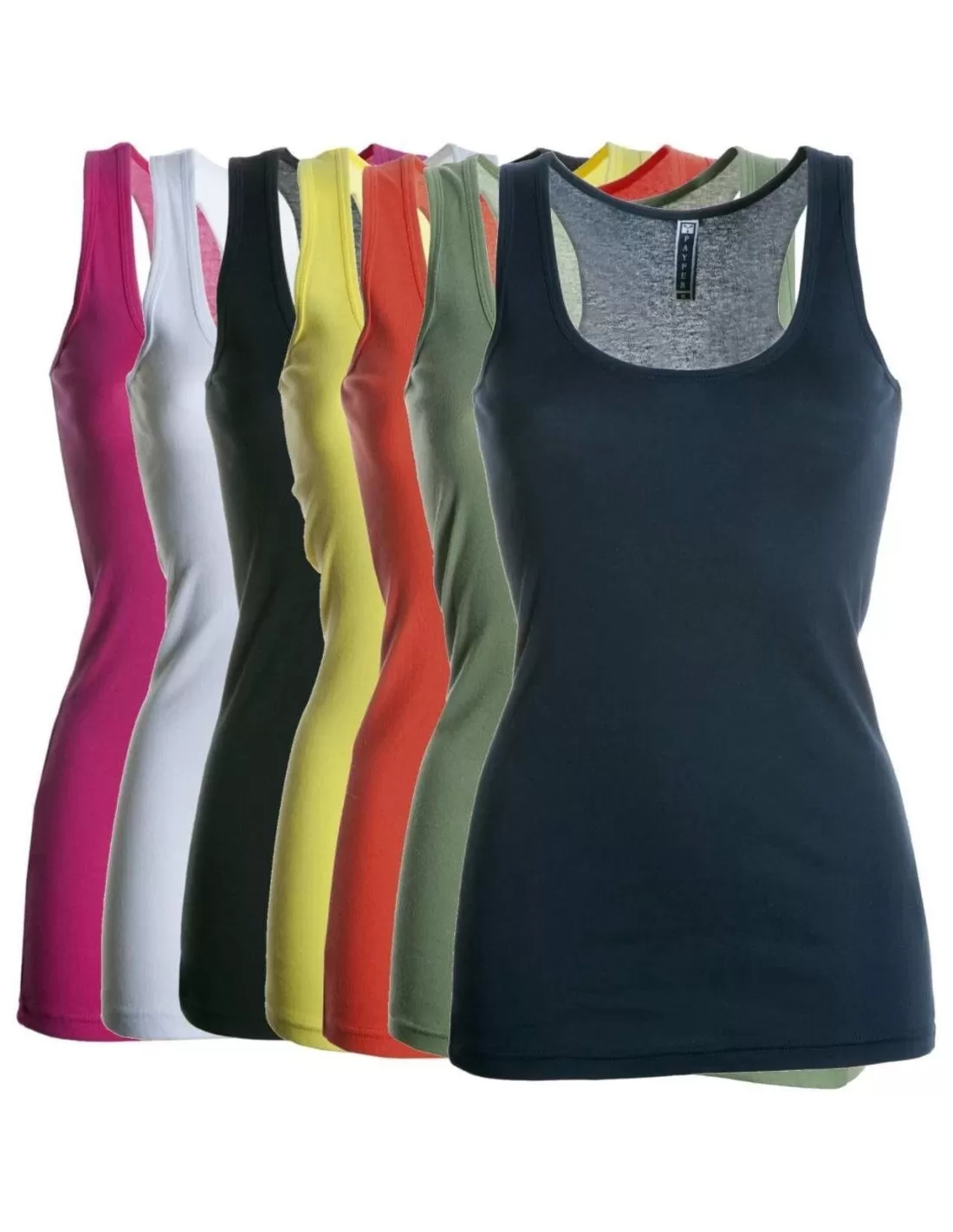 Canotta sfiancata da donna con girocollo ampio, colletto e bordo manica da 1 cm, spalline incrociate sul retro