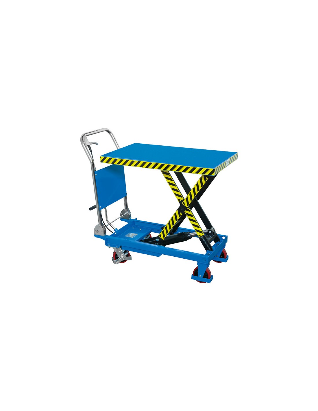 A pantografo con maniglia ripiegabile, dotato di sistema di bloccaggio meccanico della piattaforma e ruote pivotanti frenate