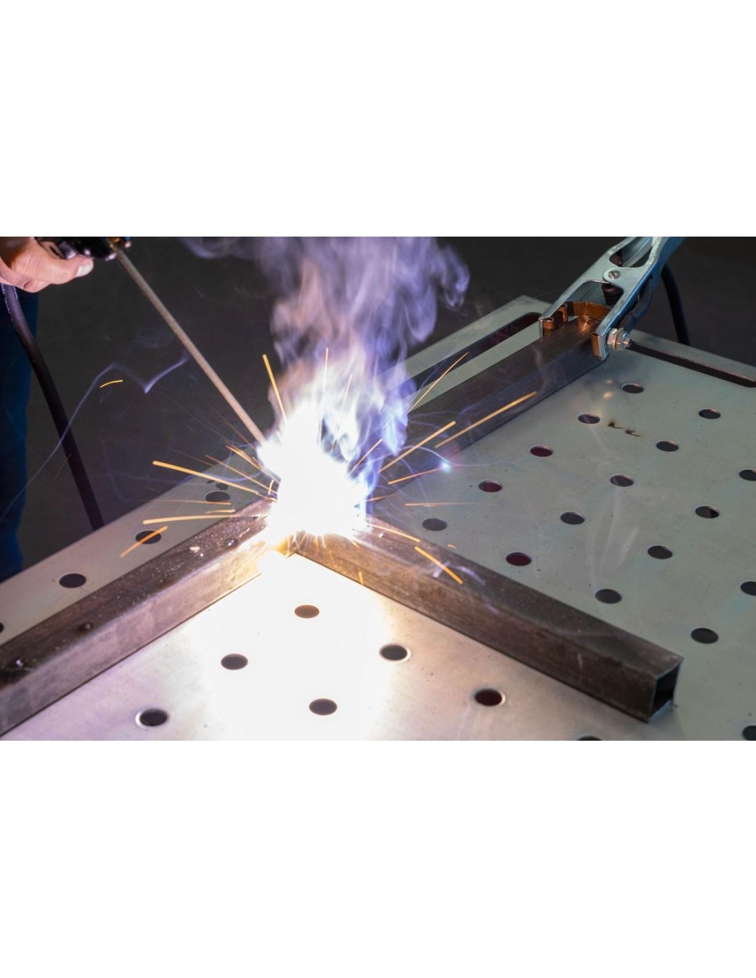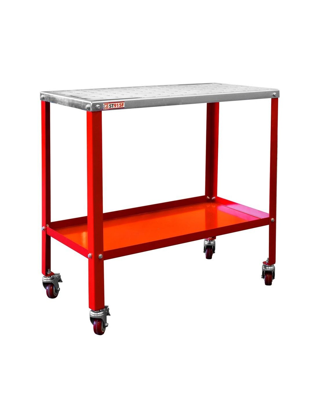 Carrello per saldatura mobile di costruzione robusta, dotato di tavolo superiore forato e vassoio inferiore per riporre utensili e accessori.