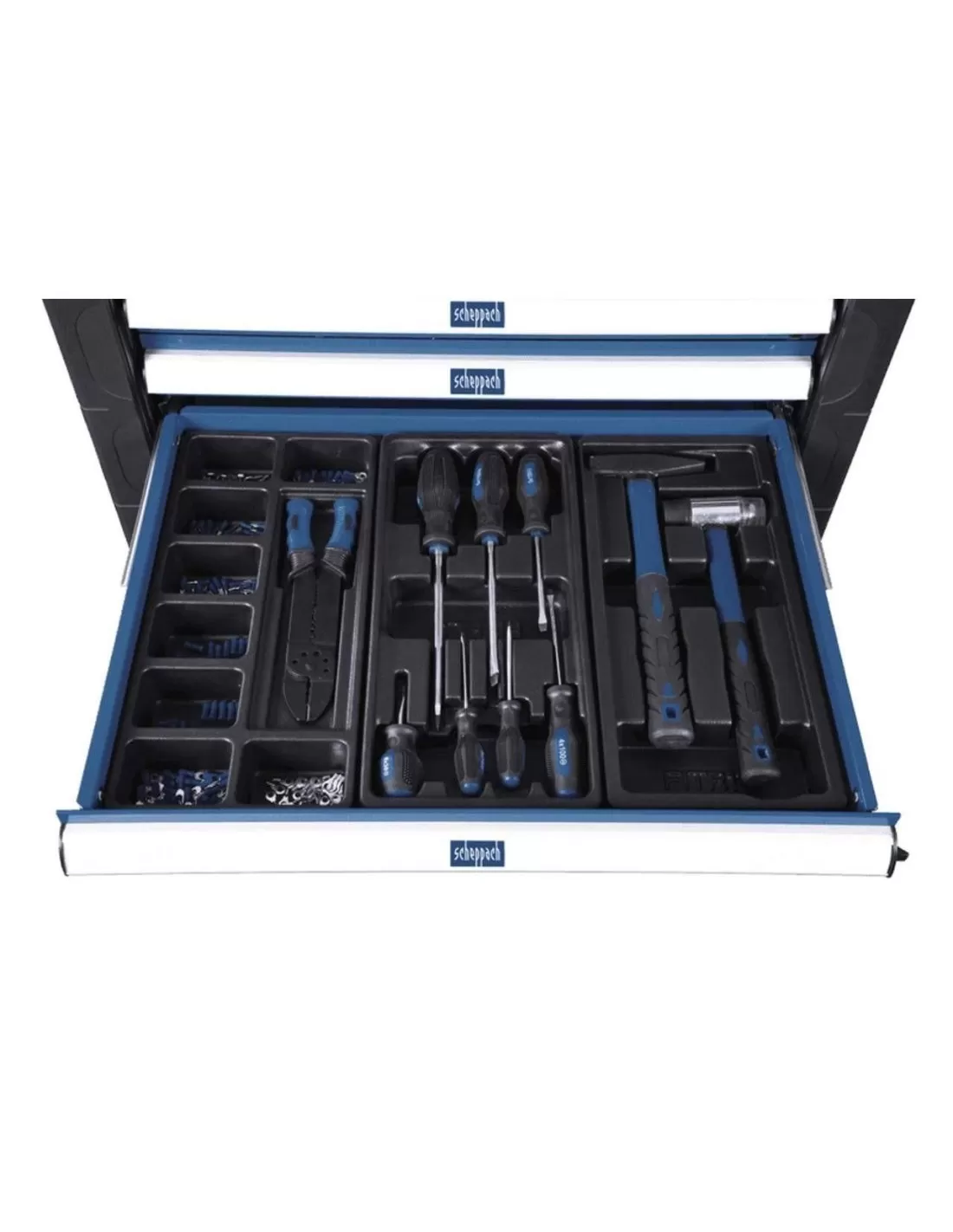 Il carrello da officina viene fornito con 263 pezzi. Tra le altre cose, contiene strumenti comuni come un martello e un martello di plastica, chiavi combinate, cacciaviti, pinze, cricchetti reversibili con vari inserti, collegamento universale, prolunghe e adattatori scorrevoli, chiavi a brugola...