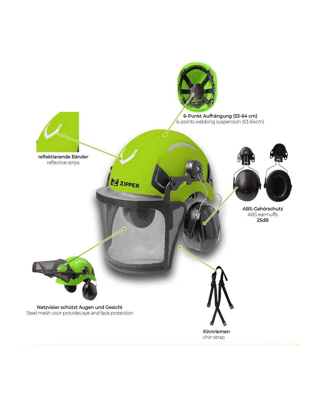 Il casco forestale ZIPPER ZI-FHProfi è l’equipaggiamento di protezione personale ideale. Non importa se stai tagliando siepi, lavorando con un decespugliatore, un tagliaerba o una motosega: questo casco ti offre una protezione affidabile. Grazie alla visiera a rete regolabile, alla dimensione del casco personalizzabile da 53 a 64 cm e alla protezione acustica integrata, la tua testa è protetta in modo ottimale.