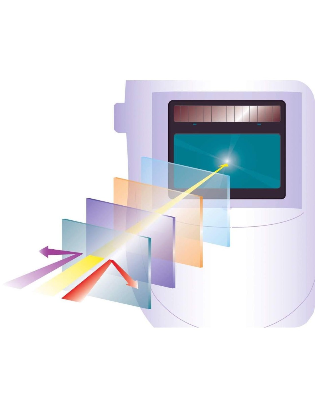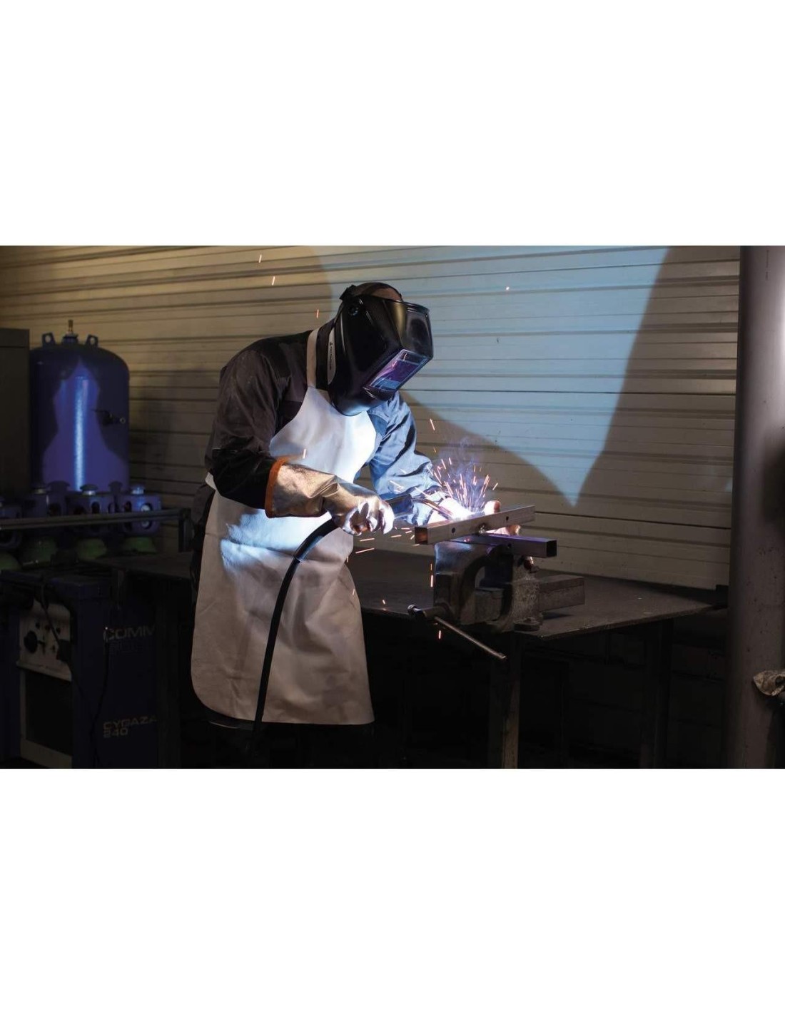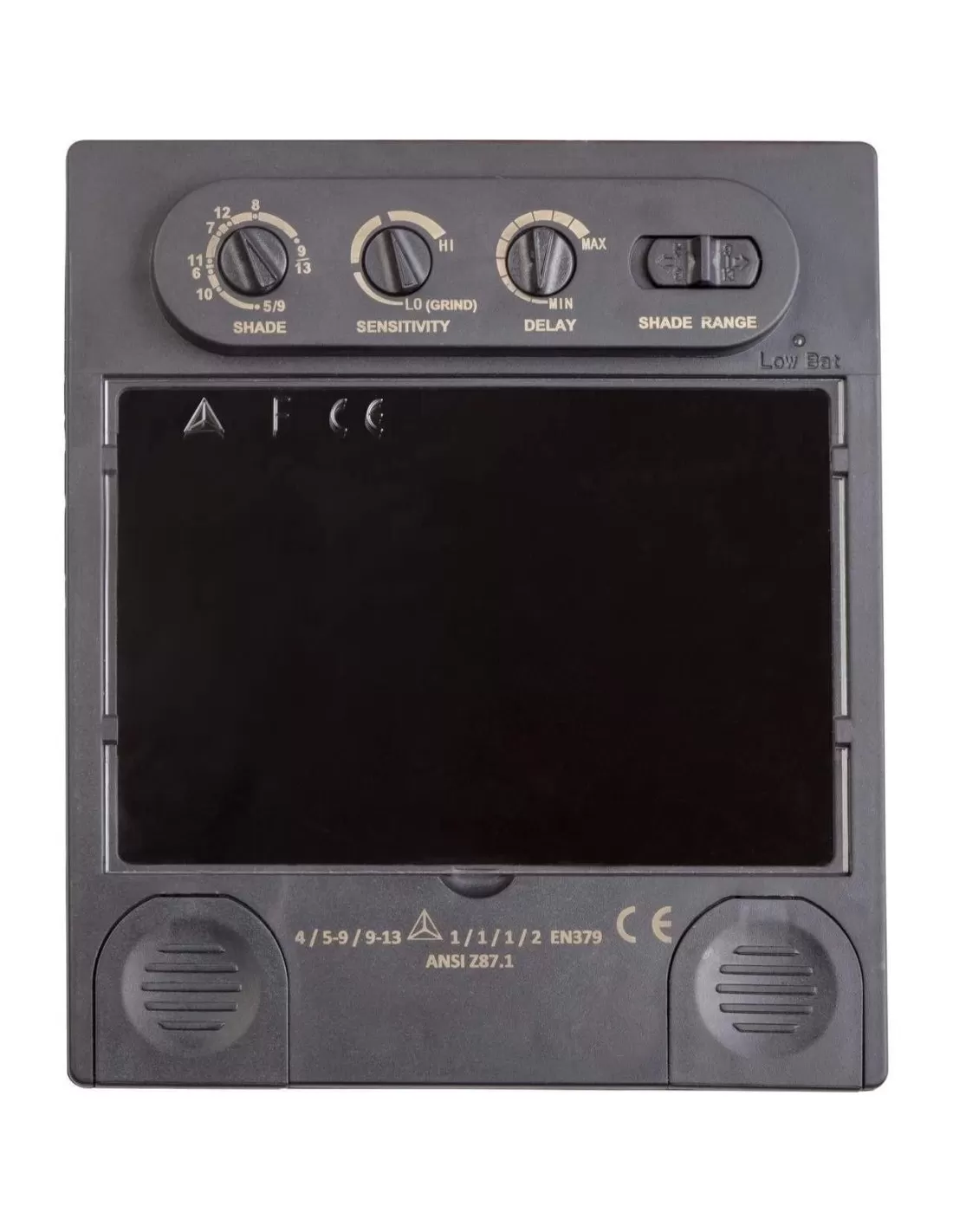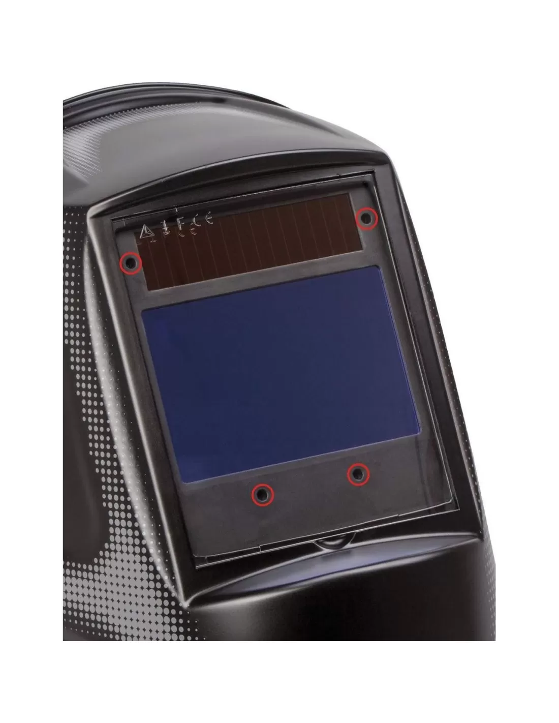 Casco per saldatura ad arco elettrico con schermo auto oscurante. Può essere utilizzato per saldatura MIG, MAG, TIG e plasma che necessitano di una protezione di tinta da DIN9 a DIN13.