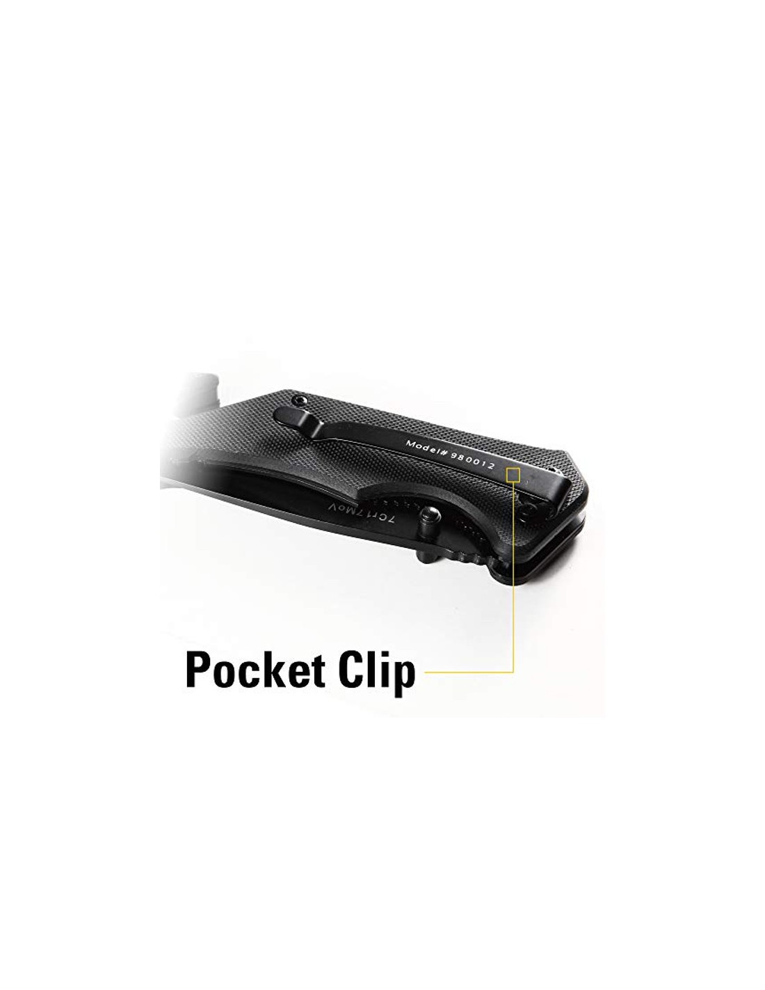 Questo fantastico coltello pieghevole con lama Drop Point da 20 cm include una clip per la cintura e un piccolo puntale al tungsteno per la rottura del vetro, utile per il salvataggio e il recupero rapidi in caso di emergenza stradale.