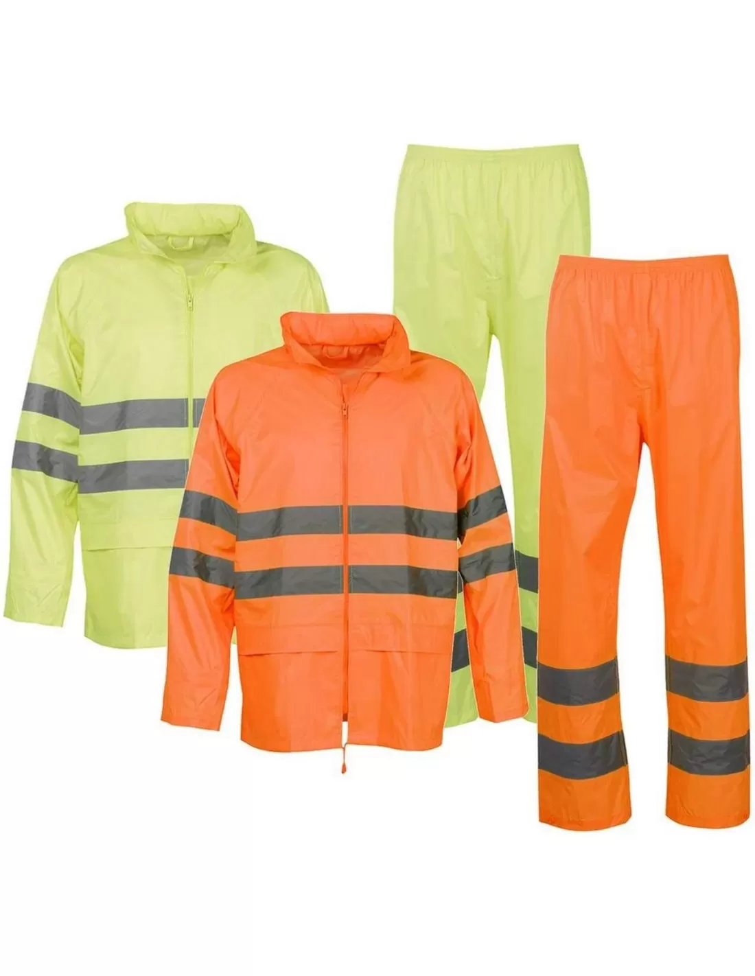 Completo antipioggia in alta visibilità con bande riflettenti, imbusto singolo con zip, giacca con cappuccio richiudibile nel colletto, retinatura sulla schiena; pantalone con due tasche.