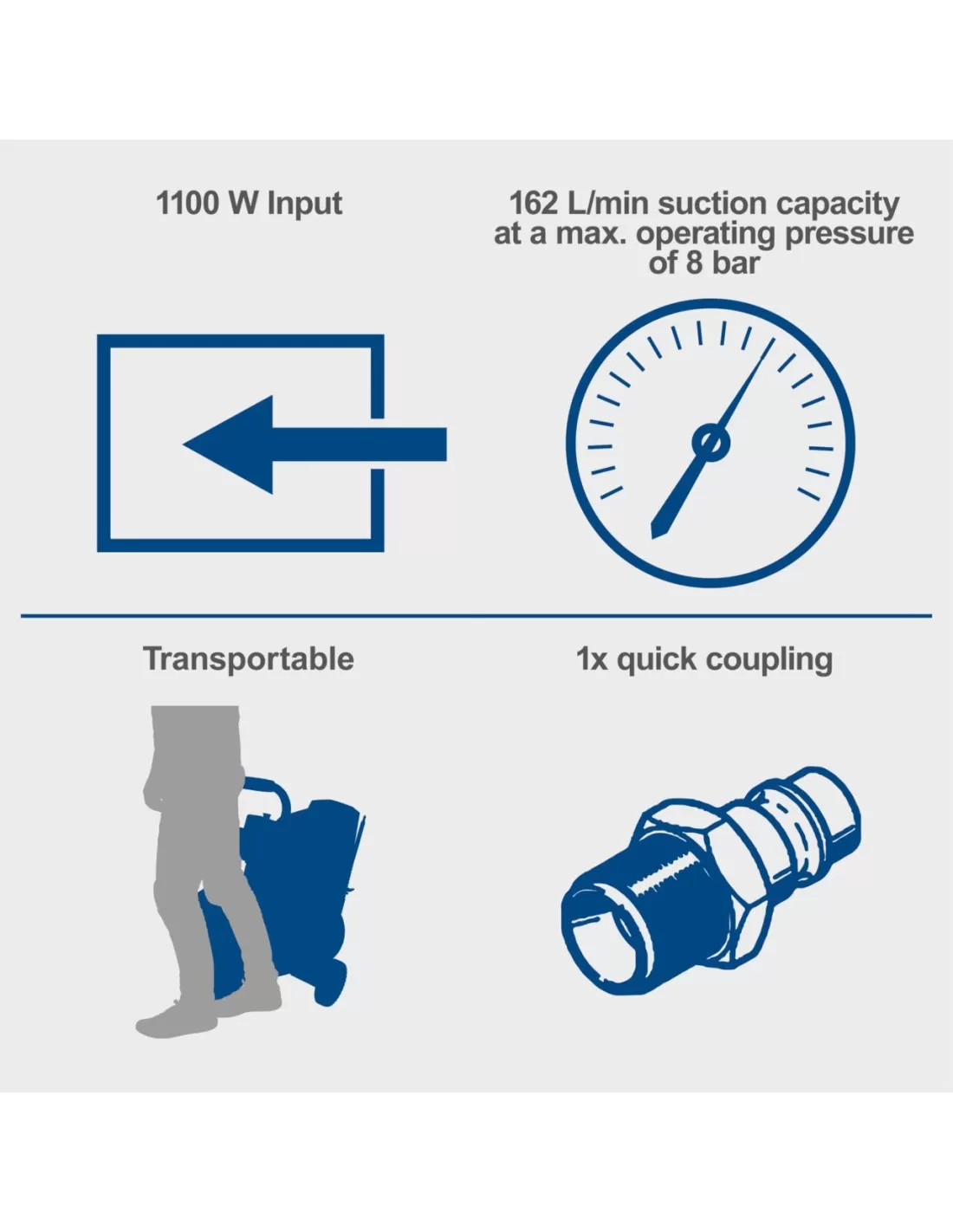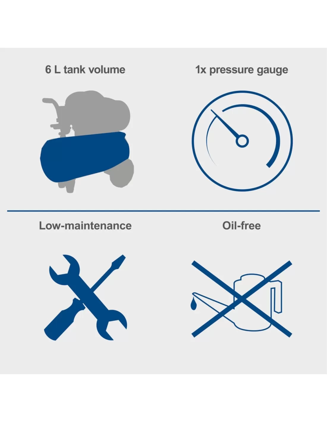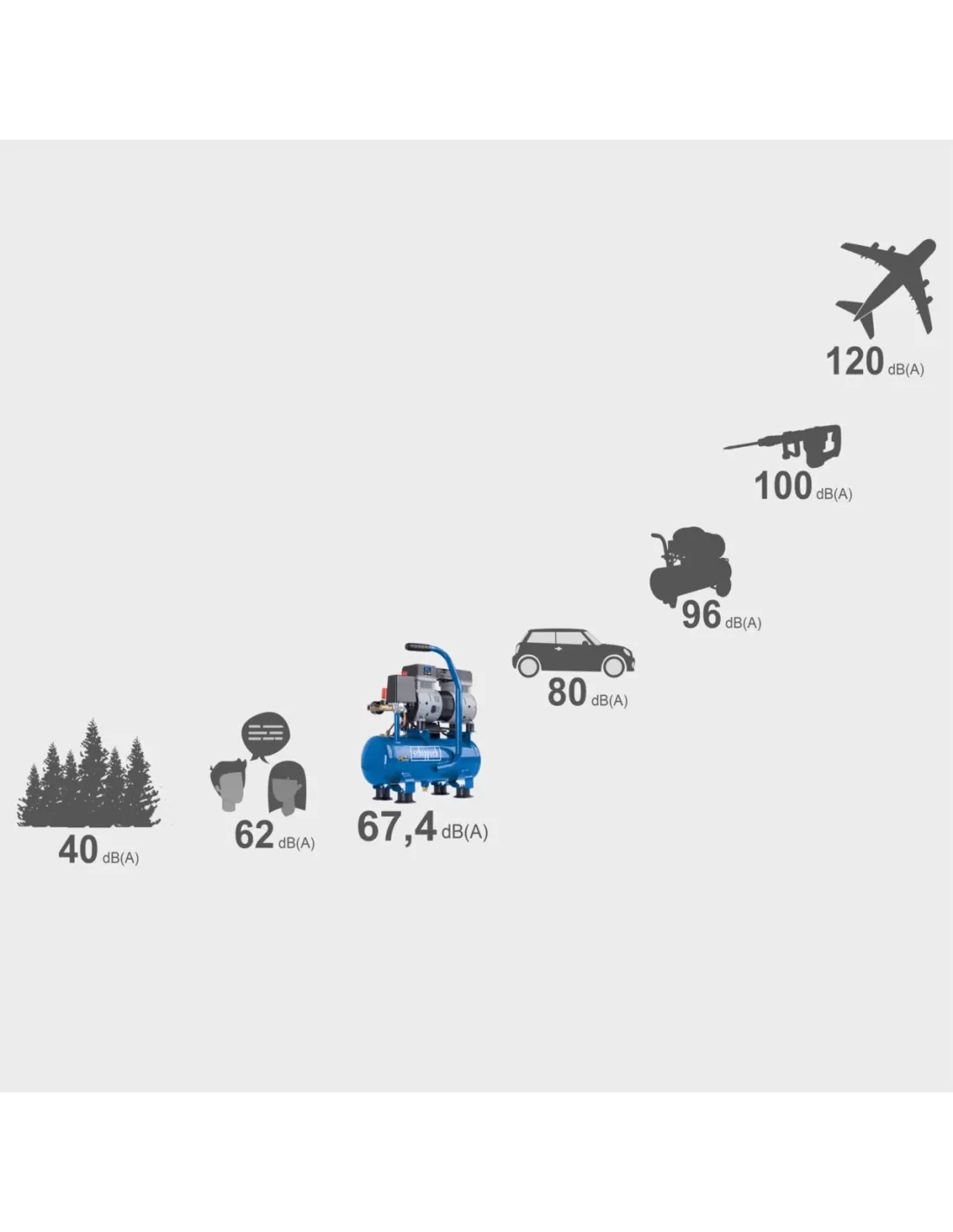 COMPRESSORE ULTRA SILENZIOSO DA 6 L - Compressore compatto - utilizzabile universalmente per lavori in casa, in officina o in garage - Dimensione della caldaia 6 L - Potente motore da 1100 W - Riduttore di pressione per un controllo ottimale della pressione di esercizio - Attacco rapido per un rapido cambio dell'utensile - Pressione massima di esercizio 8 bar - Il doppio cilindro garantisce un'elevata capacità di aspirazione e un rapido riempimento della caldaia - Compressore senza olio per una lunga durata e una manutenzione ridotta - 162 L/min Potenza di aspirazione • Piedini in gomma antivibranti per un parcheggio antiscivolo e un funzionamento silenzioso e a basse vibrazioni • Basso livello di rumorosità di 67,4 dB(A)* *I livelli di rumorosità possono variare a seconda della vicinanza e della posizione e sono stati misurati a partire da 7 metri dal pannello di controllo