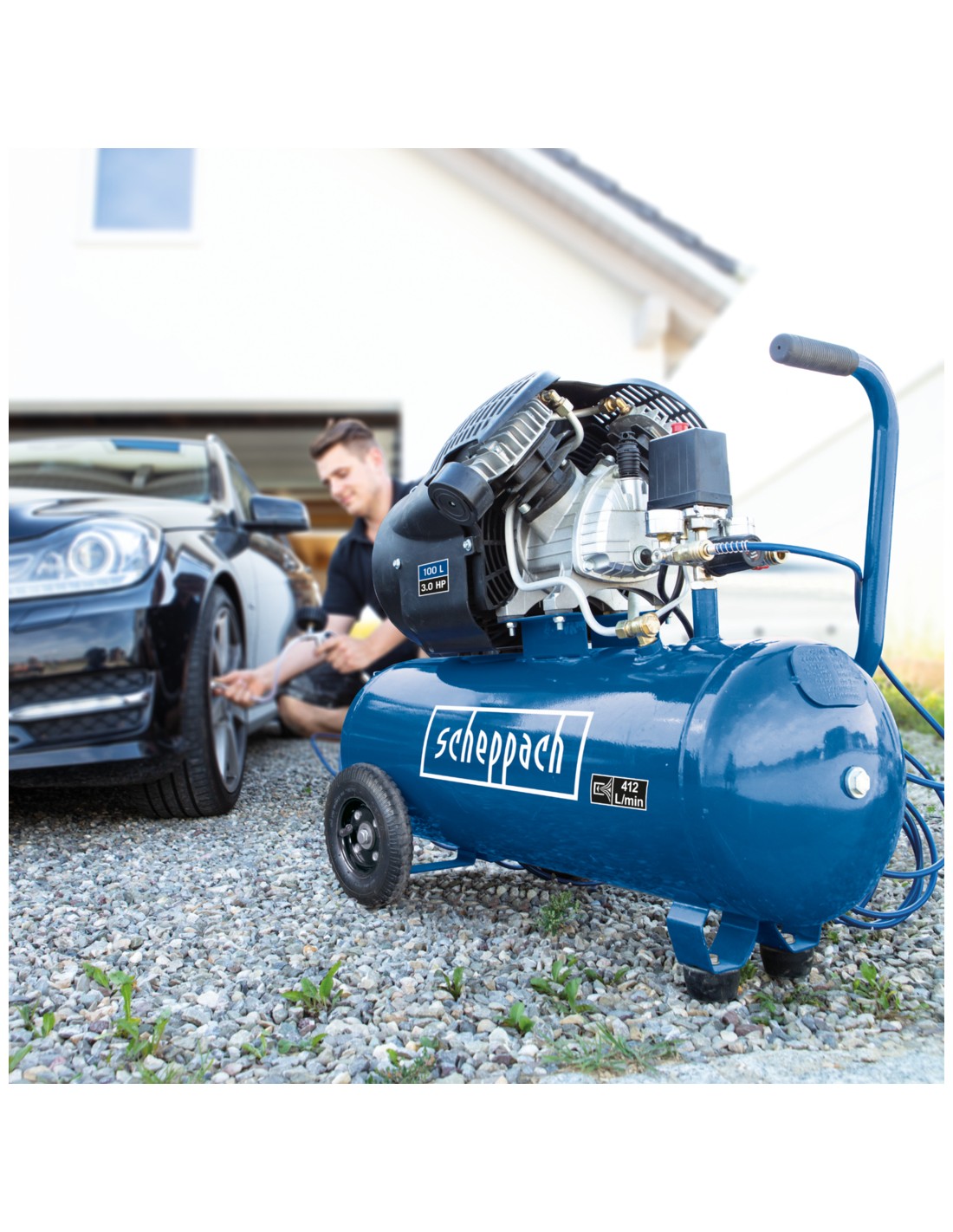 Il compressore HC120DC di Scheppach è universalmente utilizzabile per lavori in casa, in officina o in garage. Il potente compressore è adatto per utensili pneumatici