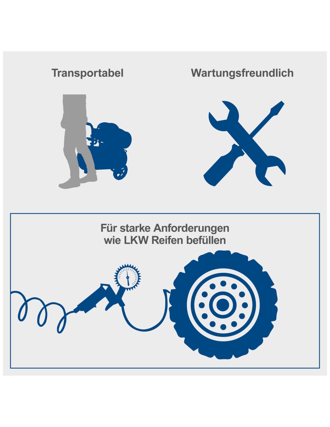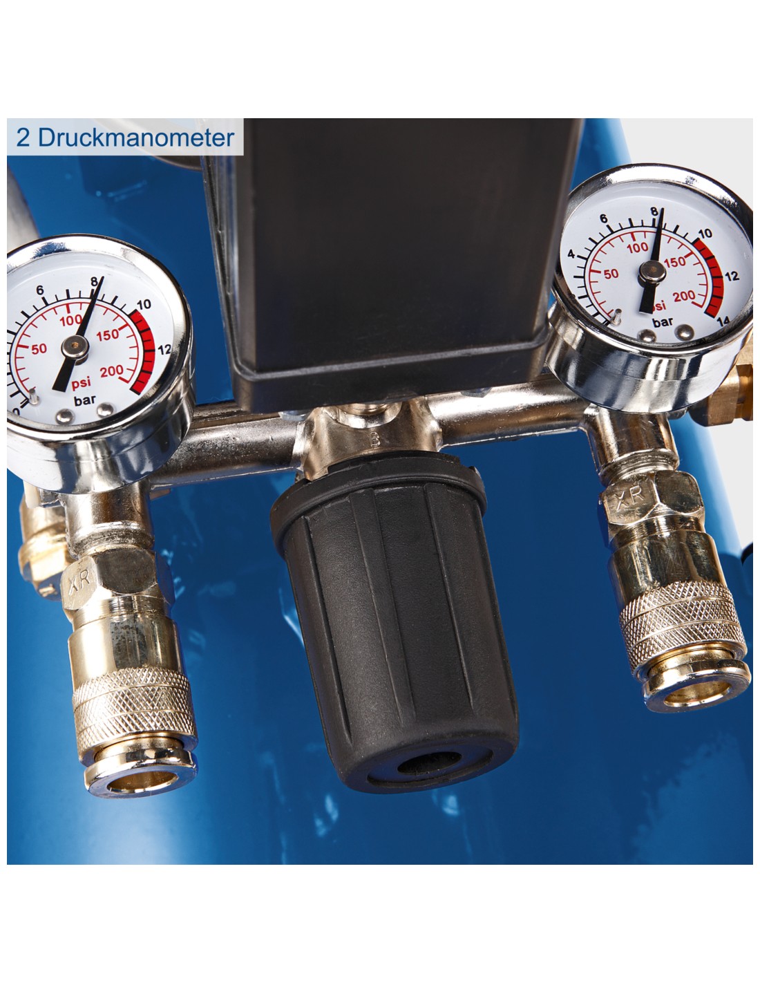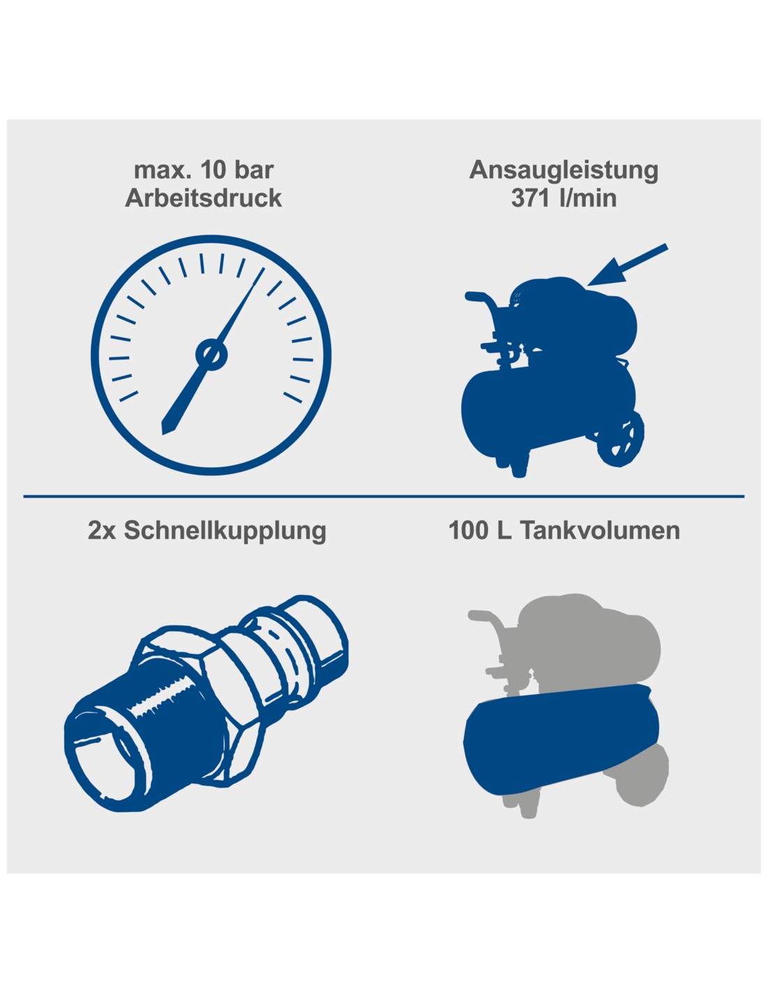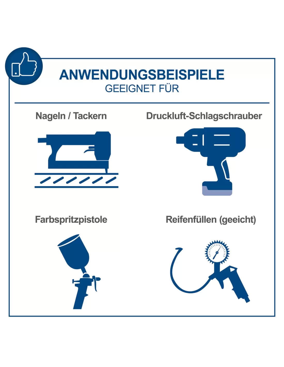 Con 2200 W, un doppio cilindro, un serbatoio da 100 litri e una pressione di esercizio massima di 10 bar, l'HC120DC è ideale anche per le sfide più impegnative. Un regolatore di pressione garantisce che il compressore HC120DC non funzioni sempre a piena potenza. La pressione di esercizio viene regolata in base alle esigenze per proteggere il dispositivo e prolungarne la durata. Il compressore è collegato a una normale rete elettrica da 230 V~, il che significa che non è necessaria una linea elettrica ad alta tensione e il compressore può essere facilmente utilizzato in casa. L'HC120DC è inoltre dotato di due attacchi rapidi, ciascuno con un manometro separato. Utilizzando un regolatore di pressione, la pressione può essere preimpostata su uno dei manometri. La pressione del serbatoio viene letta e registrata sull'altro manometro. I due attacchi consentono un rapido cambio degli utensili, poiché è possibile collegare due utensili al compressore contemporaneamente. Grazie alle sue dimensioni compatte, il compressore troverà posto in qualsiasi officina. È inoltre dotato di un pratico carrello con due robuste ruote e una maniglia per un trasporto comodo e semplice. La base in gomma antivibrante garantisce un deposito antiscivolo.