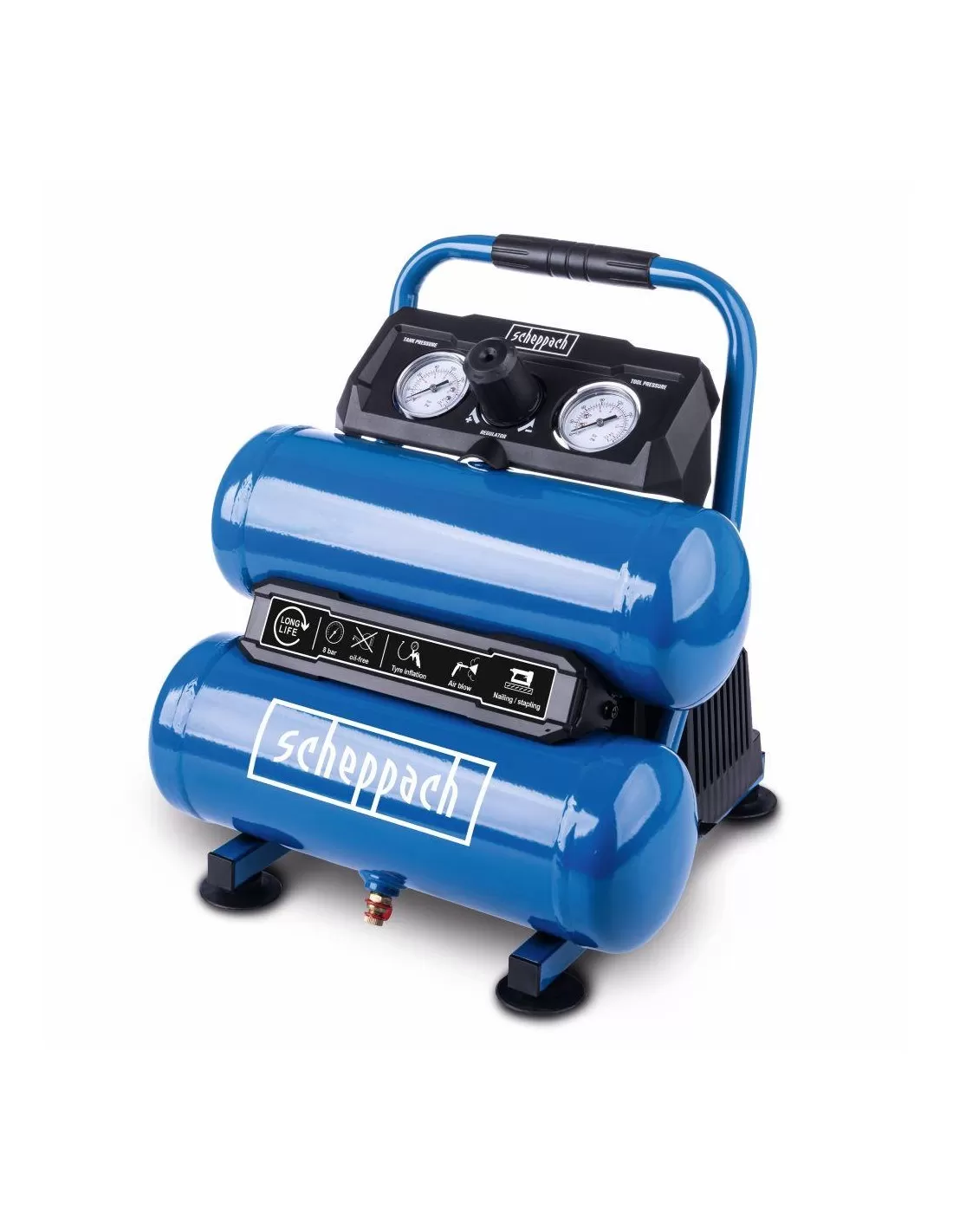Grazie alla sua struttura particolarmente compatta con due serbatoi di aria compressa montati uno sopra l'altro e una pressione di esercizio di 8 bar, il compressore Scheppach HC10-Twin è adatto a tutti i lavori in casa, in garage o in officina.