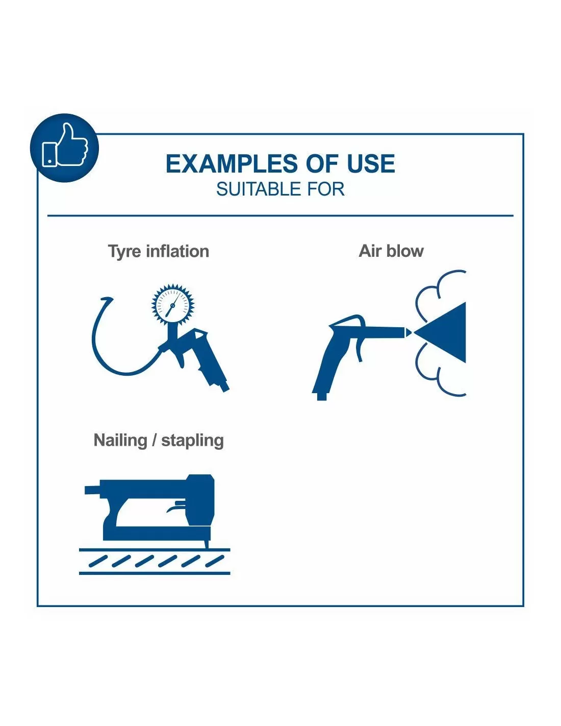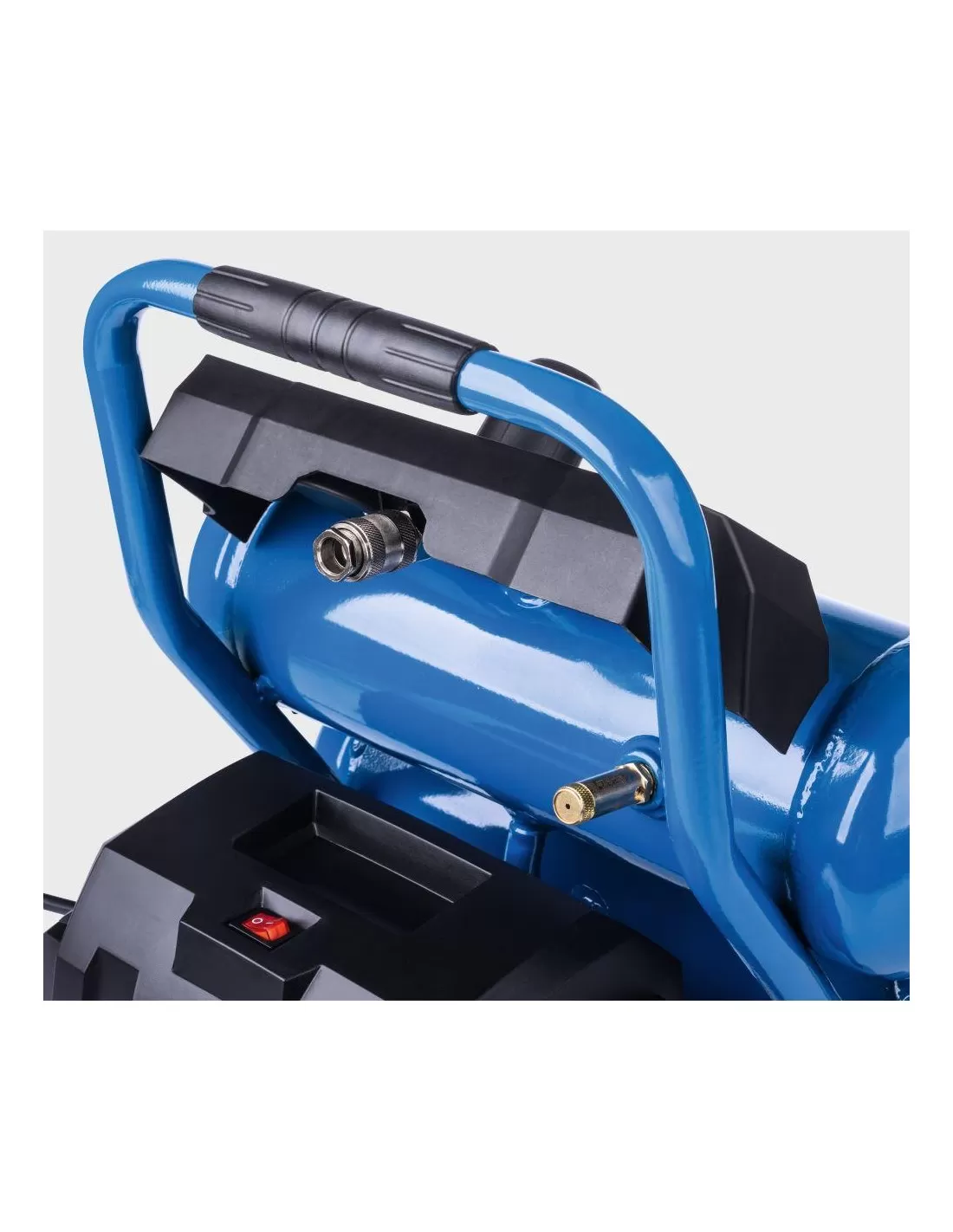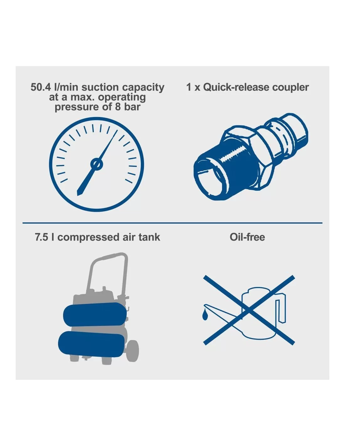 Con i due serbatoi di aria compressa con un volume totale di 7,5 L, il potente motore elettrico da 750 Watt e una potenza di aspirazione di 50,4 litri al minuto, è l'aiutante ideale per il gonfiaggio di pneumatici di auto o biciclette, palloni, materassi ad aria, o per l'utilizzo di accessori ad aria aria compressa.