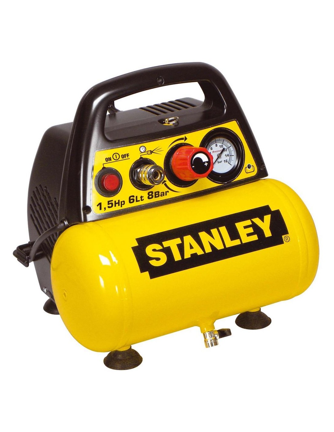 Stanley D 200 è un compressore ad aria con motore da 1,5 HP e serbatoio da 6 litri. Fa parte della categoria "compressori coassiali oilless", dotato di gruppo pompante realizzato in alluminio pressofuso caratterizzato dall'assenza di lubrificazione, con motore a bassa velocità estremamente silenzioso, perfetto per i lavori in casa e il bricolage. Pratico da utilizzare grazie al completo pannello di controllo; comodo grazie alla presenza di ganci: uno per gli accessori e due per arrotolare il cavo elettrico. E' dotato di piedini a ventosa che assicurano un'ottima stabilità ed è facile da trasportare e da riporre.Stanley D 200 è un compressore ad aria con motore da 1,5 HP e serbatoio da 6 litri. Fa parte della categoria "compressori coassiali oilless", dotato di gruppo pompante realizzato in alluminio pressofuso caratterizzato dall'assenza di lubrificazione, con motore a bassa velocità estremamente silenzioso, perfetto per i lavori in casa e il bricolage. Pratico da utilizzare grazie al completo pannello di controllo; comodo grazie alla presenza di ganci: uno per gli accessori e due per arrotolare il cavo elettrico. E' dotato di piedini a ventosa che assicurano un'ottima stabilità ed è facile da trasportare e da riporre.