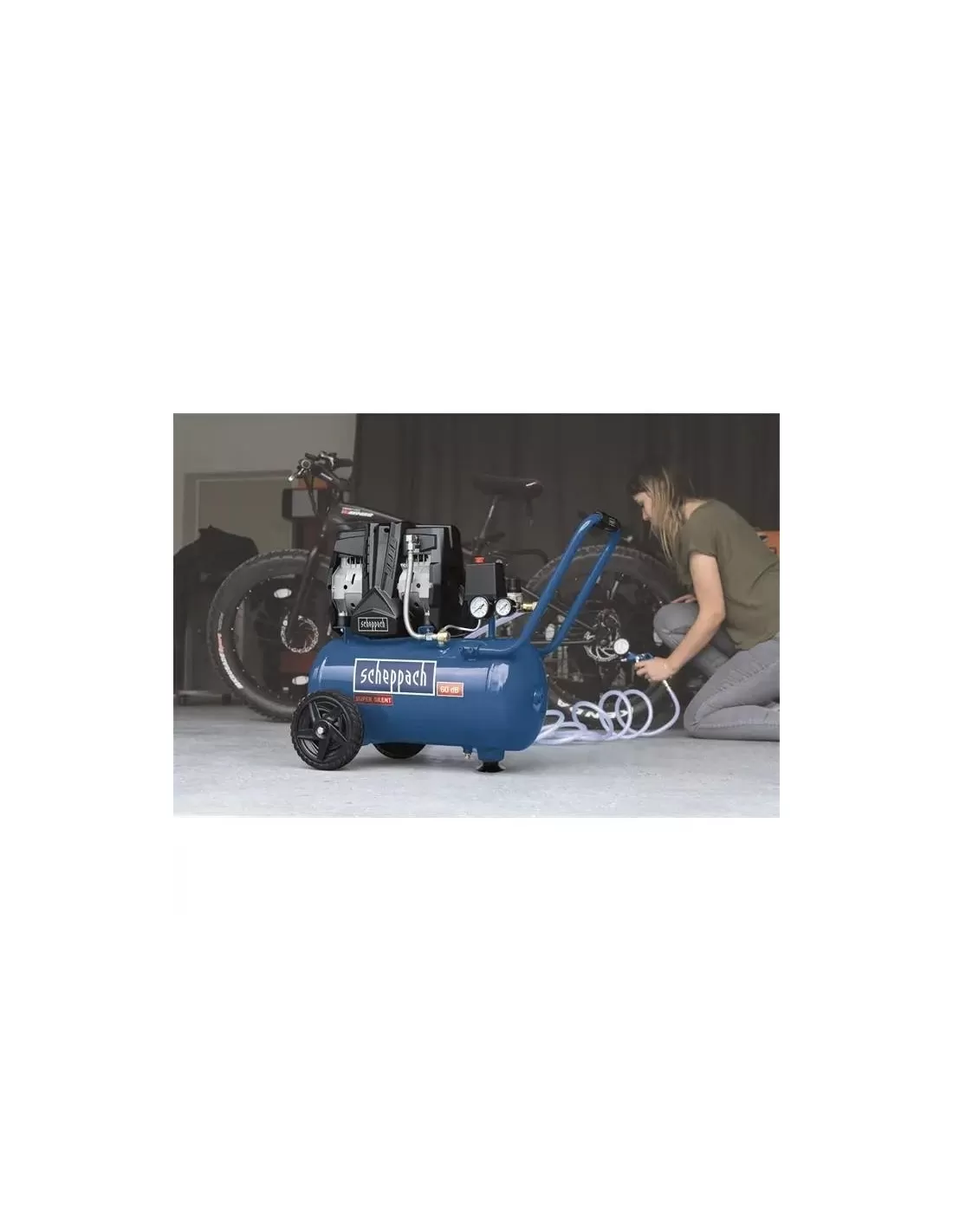 Essendo un compressore silenzioso, facilita il lavoro in diversi modi: due prese di pressione con i propri manometri consentono di cambiare rapidamente gli strumenti e di lavorare rapidamente, senza alcun rumore.