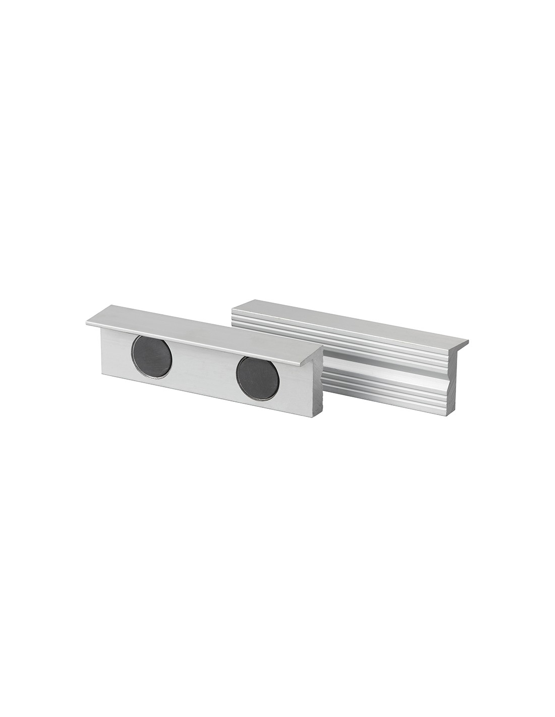 Rigate con scanalature. 2 copriganasce in alluminio per morse con strisce magnetiche adesive per rimanere ben salde alla superficie della morsa. Queste copriganasce hanno profilo rettangolare e parallelo e possono essere utilizzati su tutti i tipi di morsa