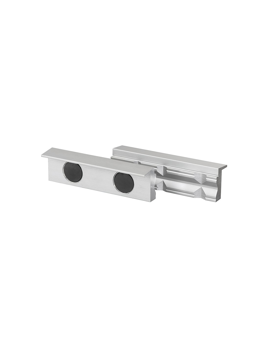 Con ganasce trapezoidali. 2 copriganasce in alluminio per morse con strisce magnetiche adesive per rimanere ben salde alla superficie della morsa. Le ganasce trapezoidali permettono di tenere insieme pezzi di verse forme. Possono essere utilizzati su tutti i tipi di morsa