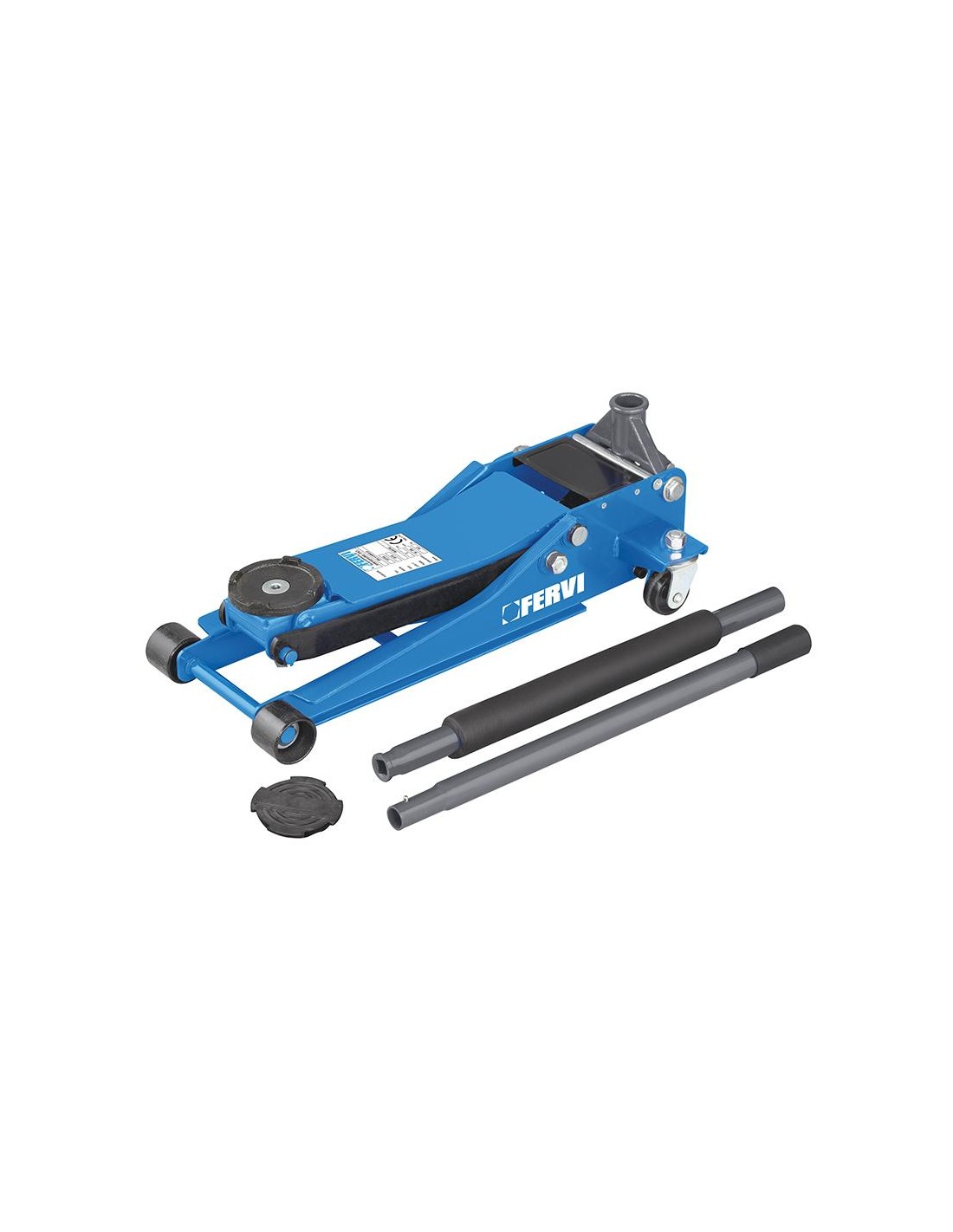 Da 2.5 ton, avvicinamento veloce con doppia pompa, con limitatore di carico. Il Cric è progettato e costruito per il sollevamento e/o abbassamento di carichi, ed in particolare i veicoli per le consuete operazioni di manutenzione e/o riparazione. L’articolo è caratterizzato da un doppio pompante con sella smontabile e tampone in gomma. Il cric è formato da un telaio portante con due ruote fisse anteriori e due ruote girevoli posteriori, da un gruppo di sollevamento costituito dal cilindro idraulico e dal braccio sollevatore, e da un gruppo di pompaggio costituito dalla pompa a stantuffo ad azionamento manuale, tramite la leva. Il sistema di comando del cric è costituito dalla pompa a stantuffo che, una volta azionata, consente l’estensione dello stelo del cilindro idraulico, cioè il sollevamento del braccio e del carico, e dalla valvola di sfiato che, una volta aperta, consente il rientro dello stelo del cilindro idraulico, cioè l’abbassamento del carico.