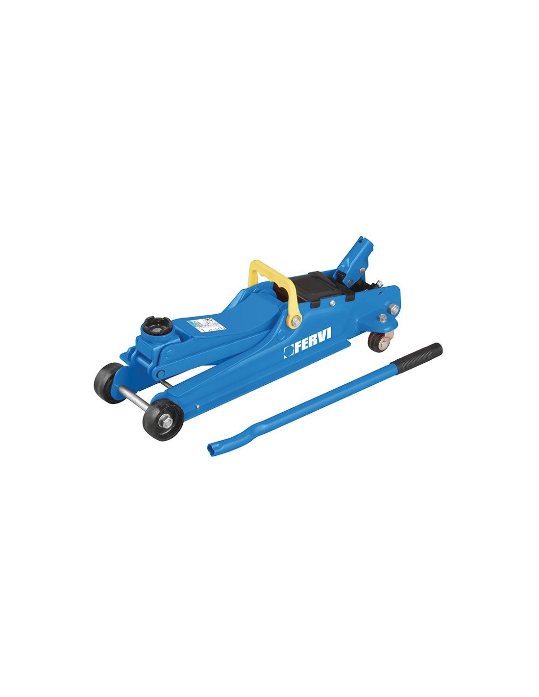 Da 2 ton, costruito in acciaio, con maniglie di sollevamento Il Cric è progettato e costruito per il sollevamento e/o abbassamento di carichi, ed in particolare i veicoli per le consuete operazioni di manutenzione e/o riparazione. L’articolo è caratterizzato da un doppio pompante con sella smontabile e tampone in gomma. Il cric è formato da un telaio portante con due ruote fisse anteriori e due ruote girevoli posteriori, da un gruppo di sollevamento costituito dal cilindro idraulico e dal braccio sollevatore, e da un gruppo di pompaggio costituito dalla pompa a stantuffo ad azionamento manuale, tramite la leva. Per agevolare il trasporto il cric è realizzato una maniglia ergonomica. Il sistema di comando del cric è costituito dalla pompa a stantuffo che, una volta azionata, consente l’estensione dello stelo del cilindro idraulico, cioè il sollevamento del braccio e del carico, e dalla valvola di sfiato che, una volta aperta, consente il rientro dello stelo del cilindro idraulico, cioè l’abbassamento del carico.