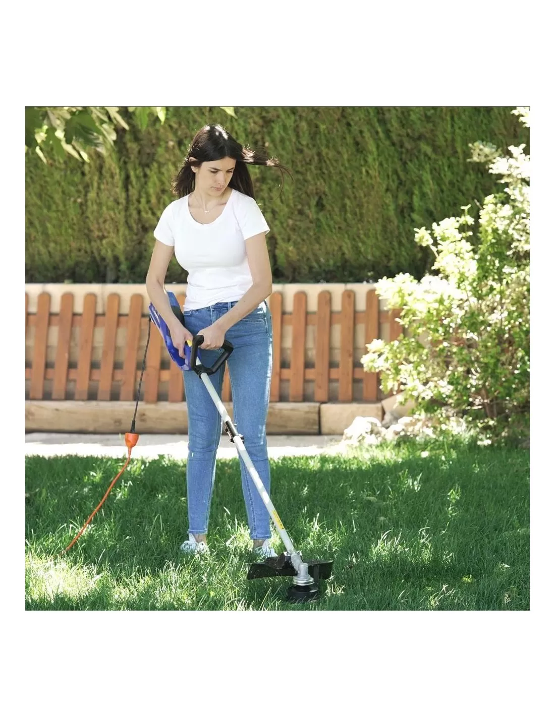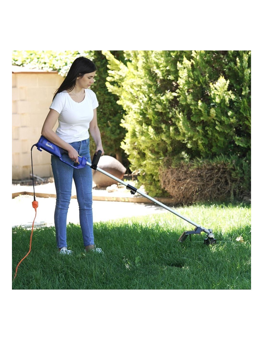 Decespugliatore elettrico potente in grado di tagliare qualsiasi tipo di vegetazione.Ideale per terreni dove un tagliaerba non può lavorare, come superfici irregolari, vicino a muri, con pietre, su scale, rampe o in luoghi elevati. Viene fornito con un motore elettrico da 1000 W e un sistema di taglio a disco a tre lame e filo di nylon per affrontare erba, erba legnosa, cespugli e ramoscelli.